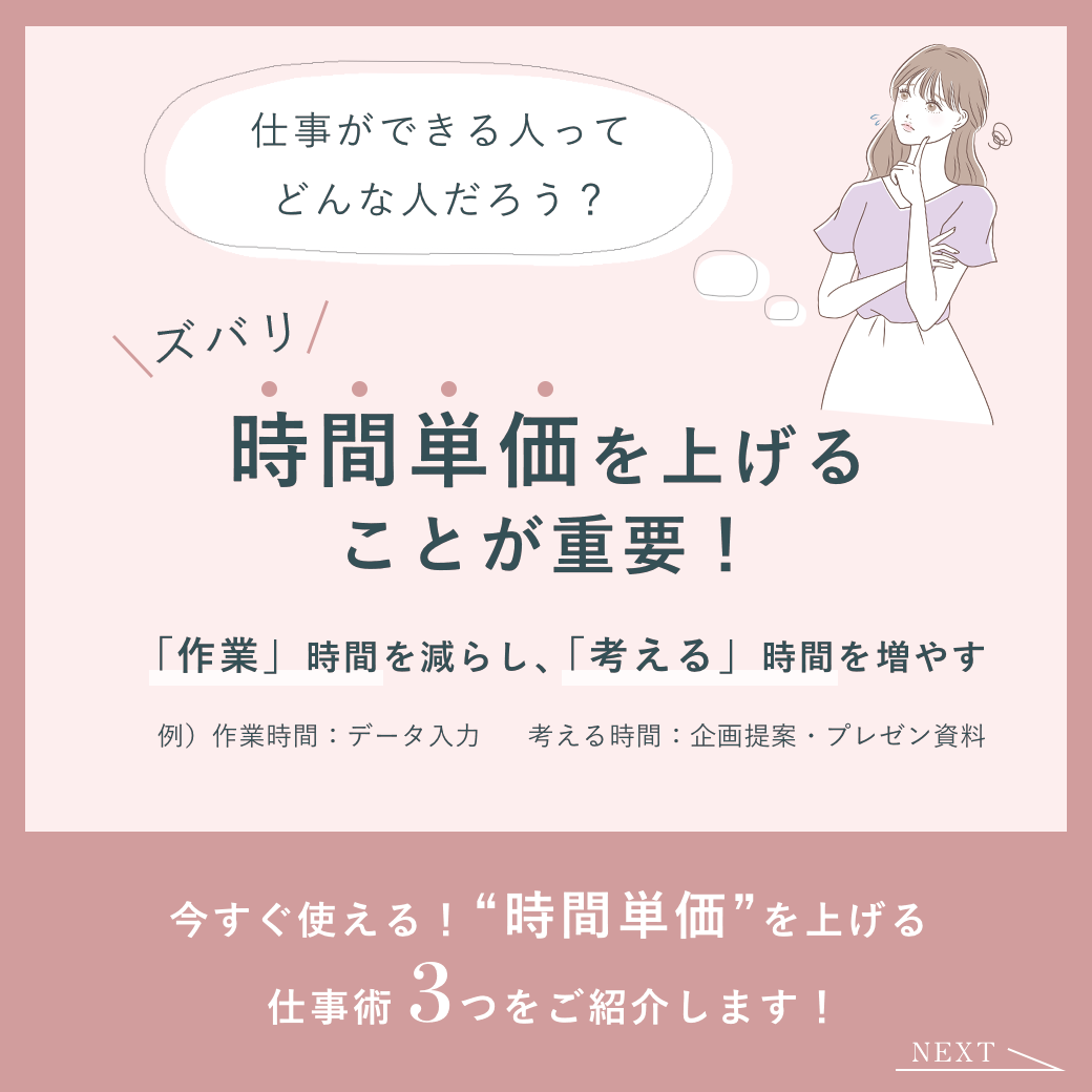・「差がつく仕事術=時間単価が高い」をテーマに業務効率手法を設定しました。