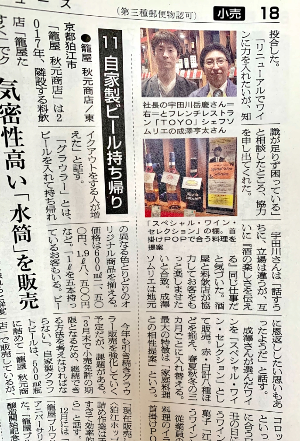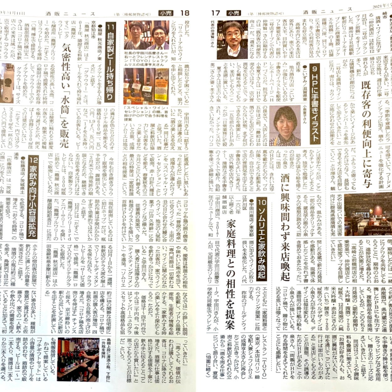 酒販ニュース Vol.2076 成澤 亨太 Kota Narusawa エグゼクティブ・ソムリエ OVERVIEW 記事掲載 YEAR 2021 酒類業界向けのリーディングペーパー、「酒販ニュース」に掲載頂きました。レストランと小売り店の取り組みは酒販店業界では珍しいらしく、取材頂けました。