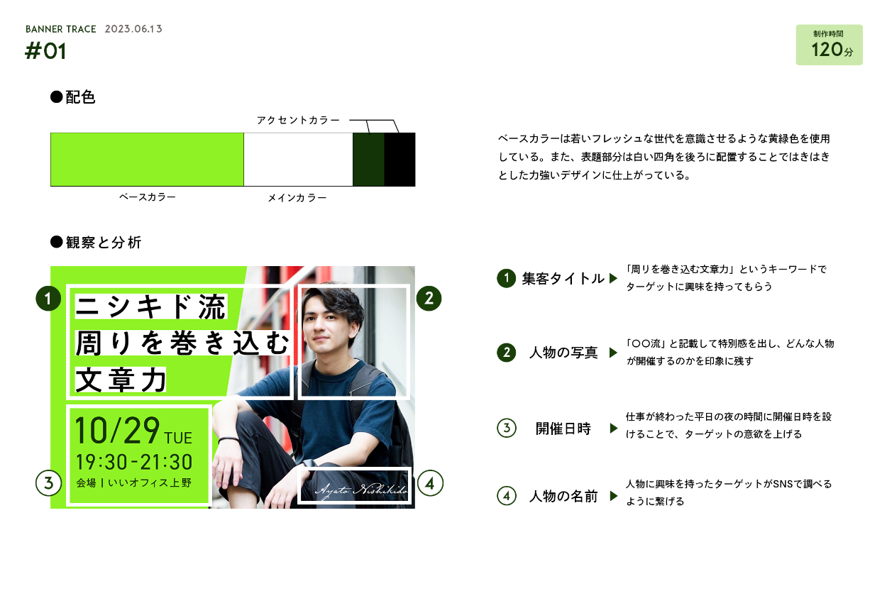 配色、レイアウト、あしらい、視線誘導、情報の優先順位についてまとめました。