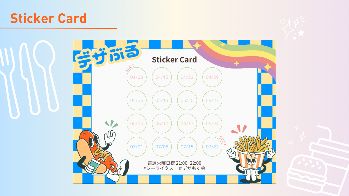 - トンマナに、レトロポップ、明るくて元気というワードがあったため『海外のファーストフード店のスタンプカード』をテーマに作成しました。