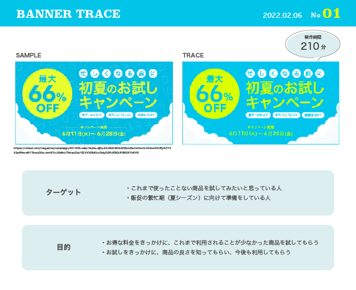 ラクスルのバナーをトレースしました。情報の優先順位とそれに基づいた配置やフォントサイズを意識してトレースしました。
