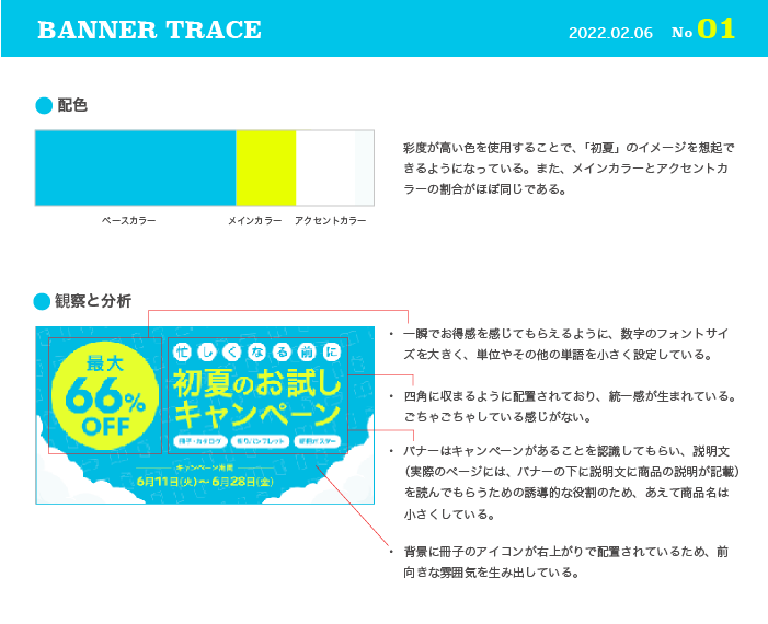 青、黄色を使用することで、「夏の販促」に向けたバナーであることを効果的に表現できていると感じました。また「66」を左に配置し、フォントサイズを大きくすることで、一瞬でキャンペーンのバナーであるということが分かるようになっています。