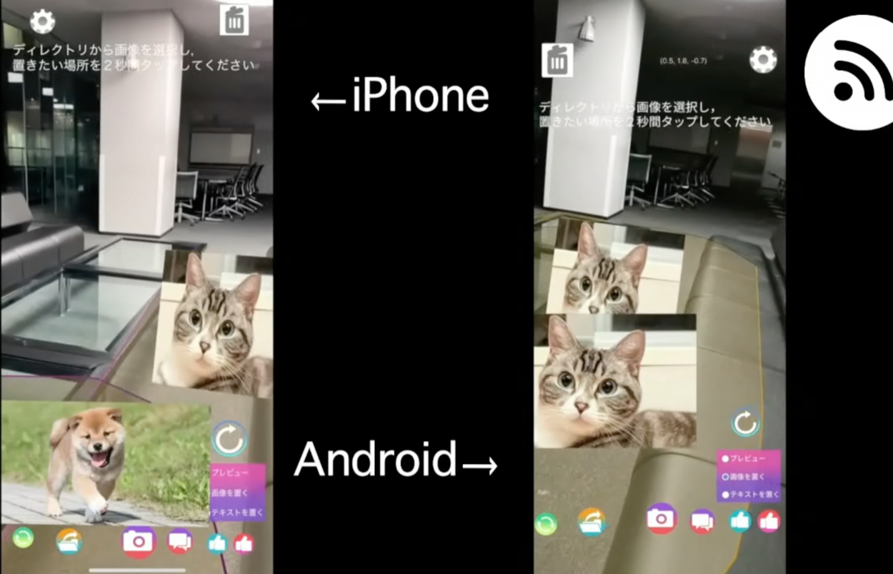 ARFoundationで開発したため、Android版とiOS版両者の違いはほとんどありません。Android版とiOS版との通信の様子を下図に示します。画像オブジェクトは設置から数秒で各ユーザのAR空間へ共有されます。
