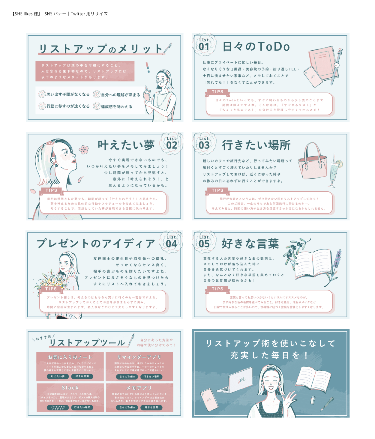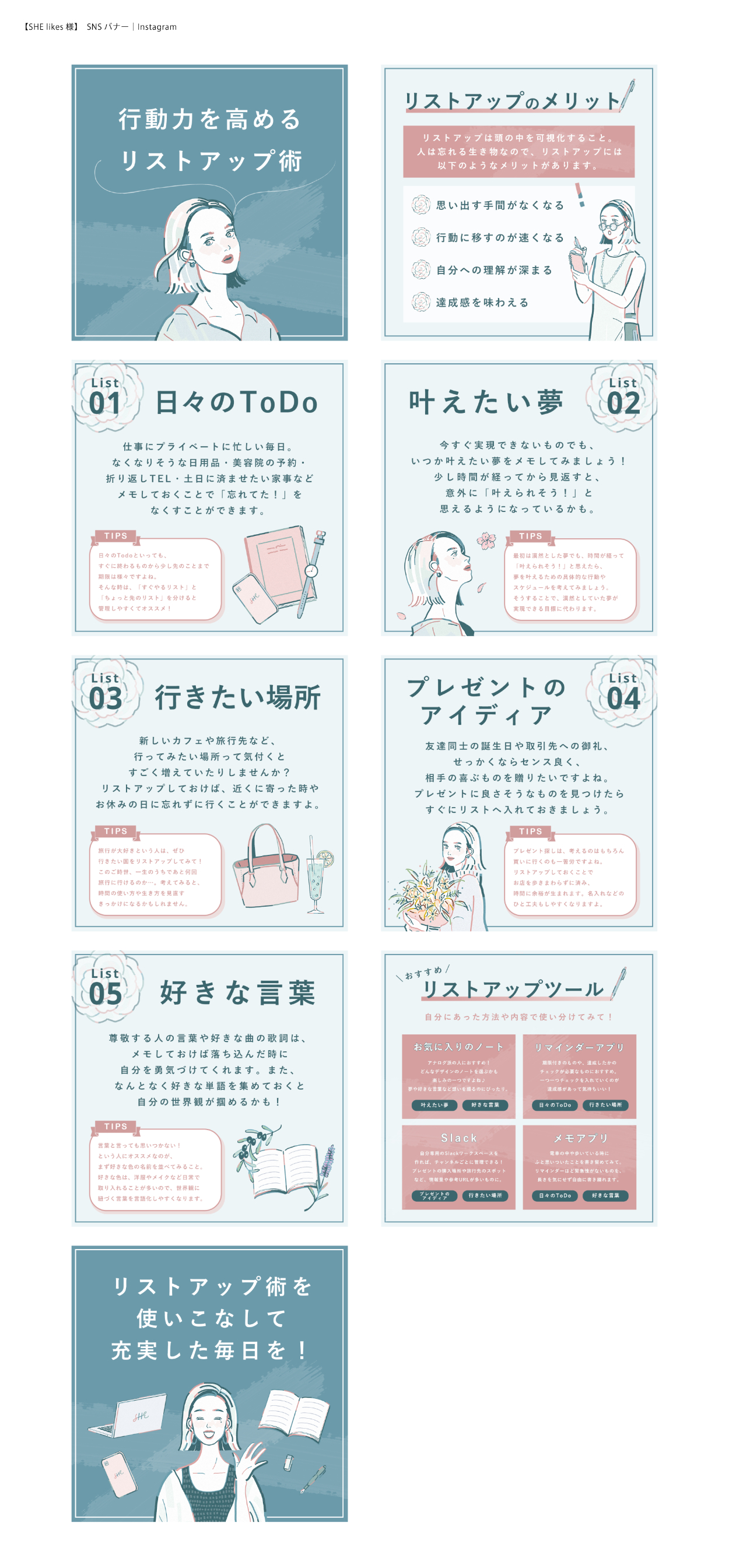 女性限定キャリアスクール「SHE likes」様のSNSバナー コンテンツ制作・デザインまでを行いました。 制作時間:約4時間