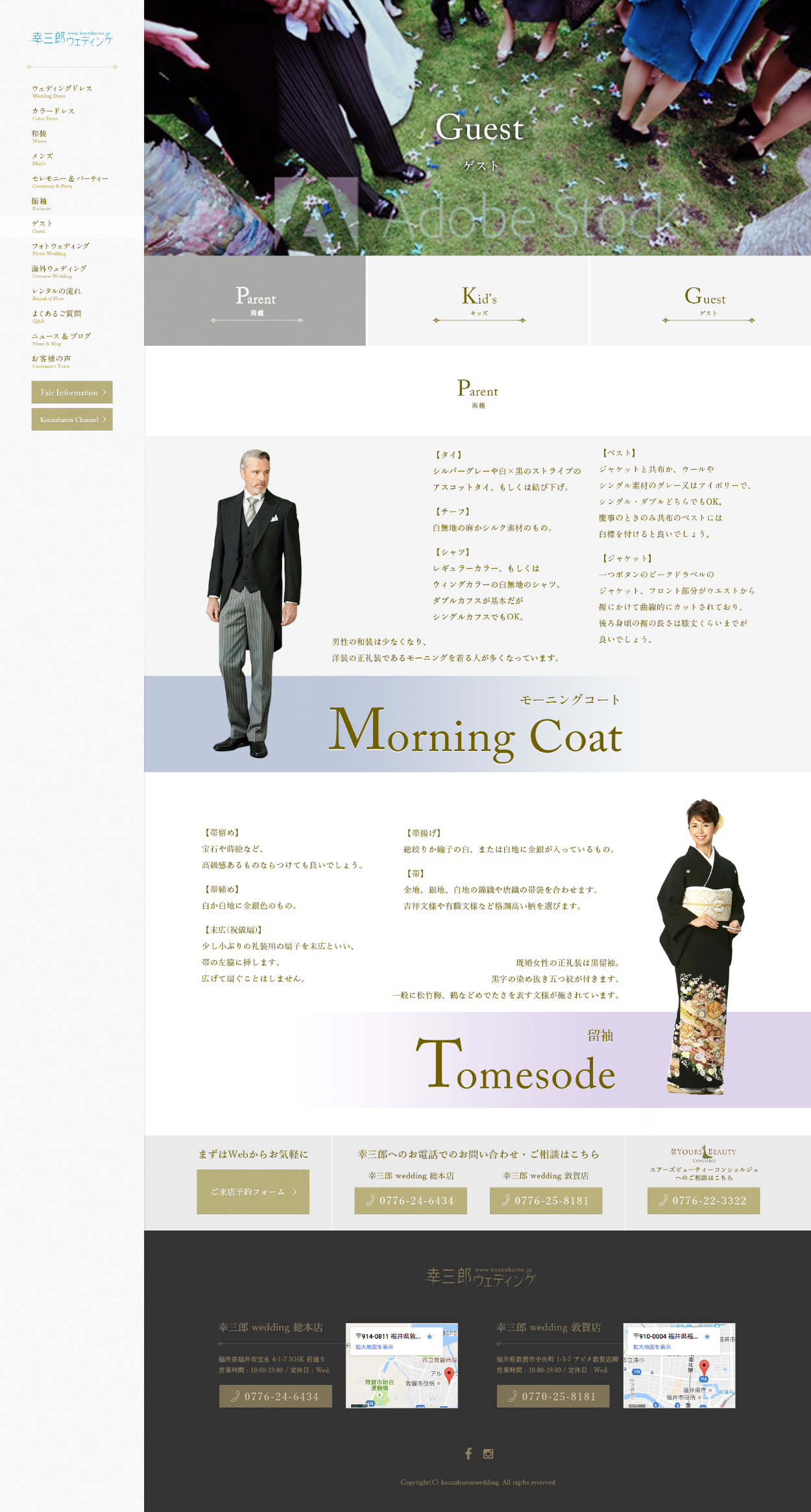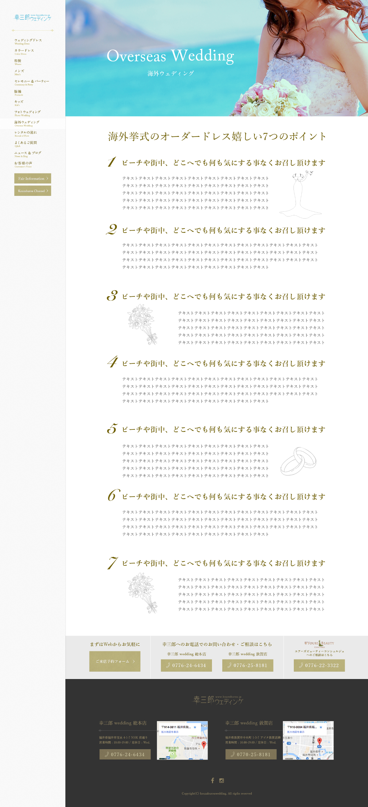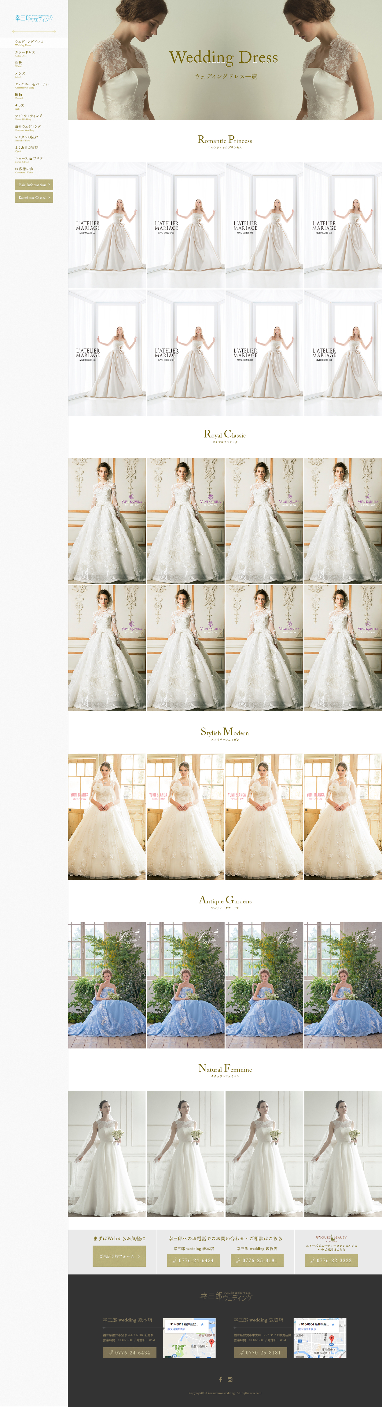 ウェディングドレスレンタル会社 コーポレートサイト - 幸三郎ウェディング様 コーポレートサイト 下層ページ作品の狙いや目的:サイト リニューアル作品のコンセプトやポイント:上品かつエレガントなデザイン制作時間:1ページ 3時間(デザイン)担当:デザイン, コーディング WEBSITE