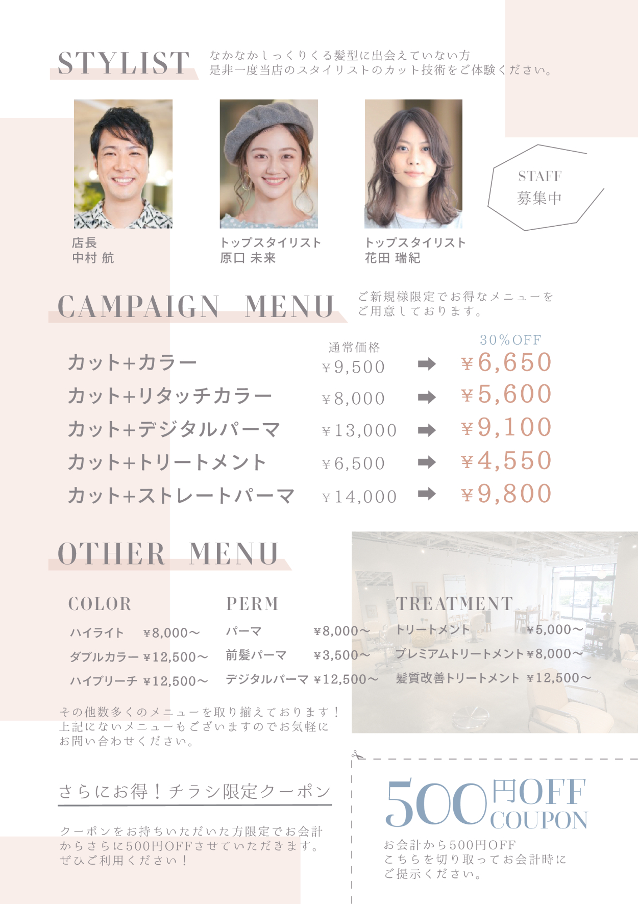 く配置、説明文を一部割愛し裏面のスタイリスト説明部分に盛り込み、実際の美容室の