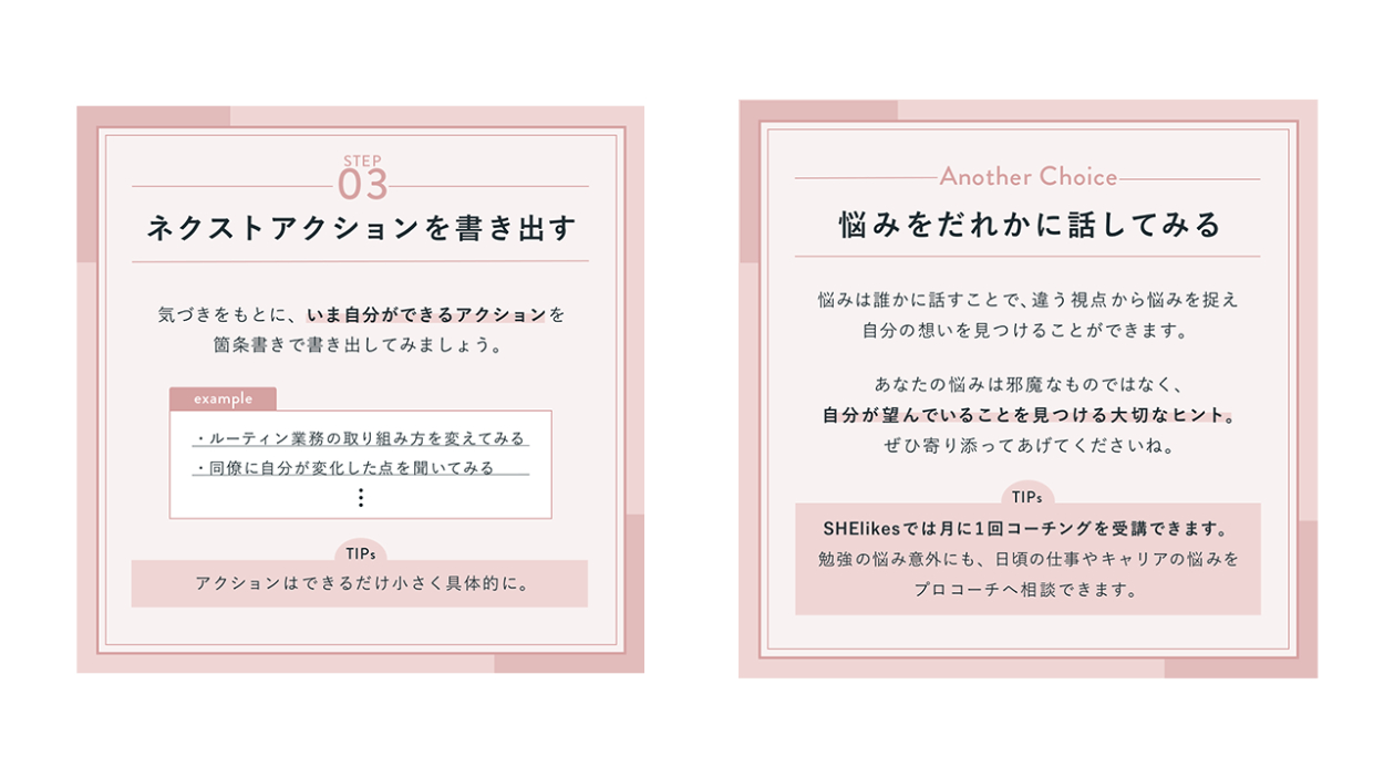 SHE株式会社が運営しているSHElikes公式Instagramのフィード投稿を制作しました。「書き出してスッキリ!お悩みデトックス3STEP」というテーマで、バナー内のライティングからデザインまで担当をしています。