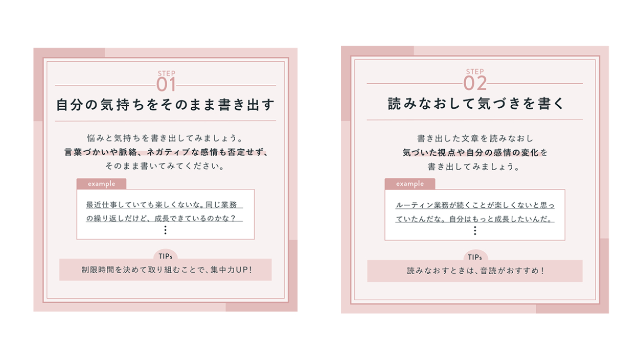 今回のテーマは書き出すことが重要なアクションであるため、実際に書き出すとした時の例文をメモ風に記載しました。具体的な例文を出すことで書き出すイメージを想起させ、実践への誘導を促しています。