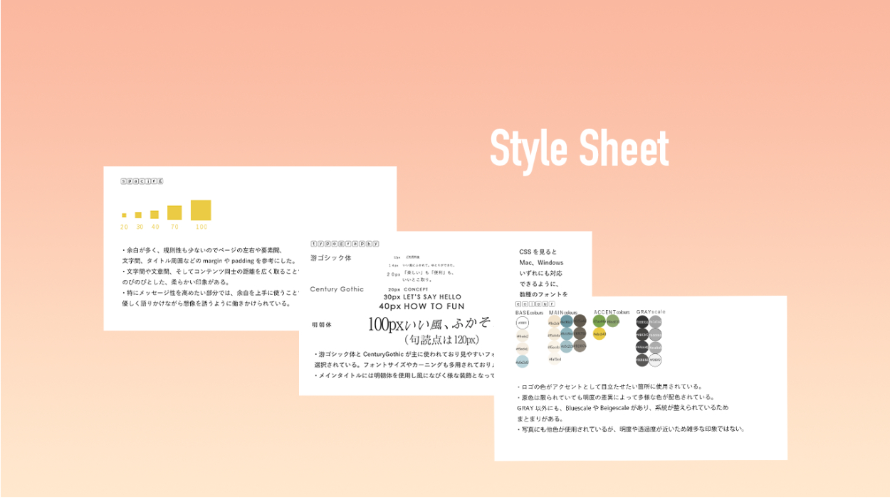 トレース時にはまず、スタイルシートを作成し配色やフォント、余白を事前に決めことで、作業の効率化を図った。抽出作業も時間がかかったが、初めに全体のスタイルを把握しておくことで後々のトレース作業の手間を省くことができた。トレースの要素が多く大変な作業だったが、そのデザインがどのように創られているのかを分析して理解しながらトレースに取り組むことができた。