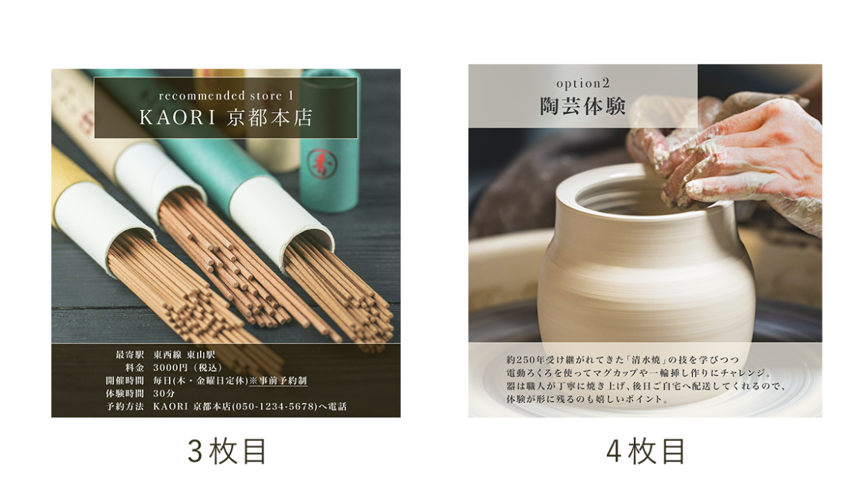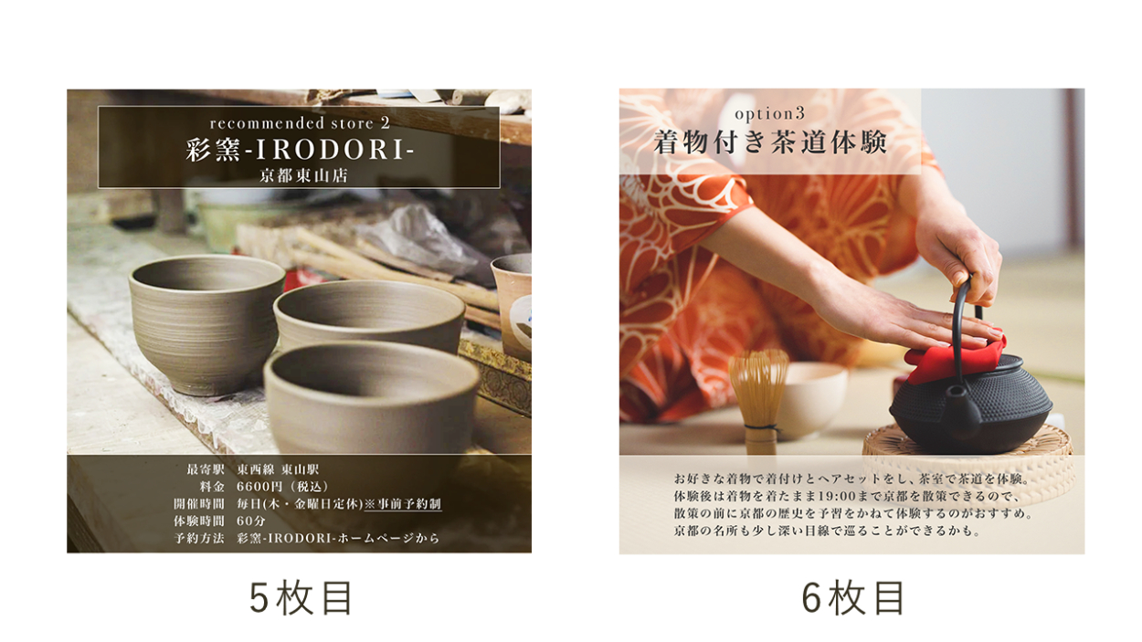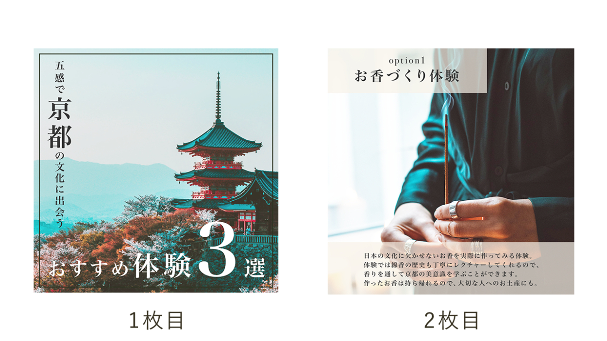 自主制作として「京都でできるおすすめ体験」をテーマに、京都の魅力を伝えるインスタグラムのフィード投稿を制作しました。(制作時間5時間)