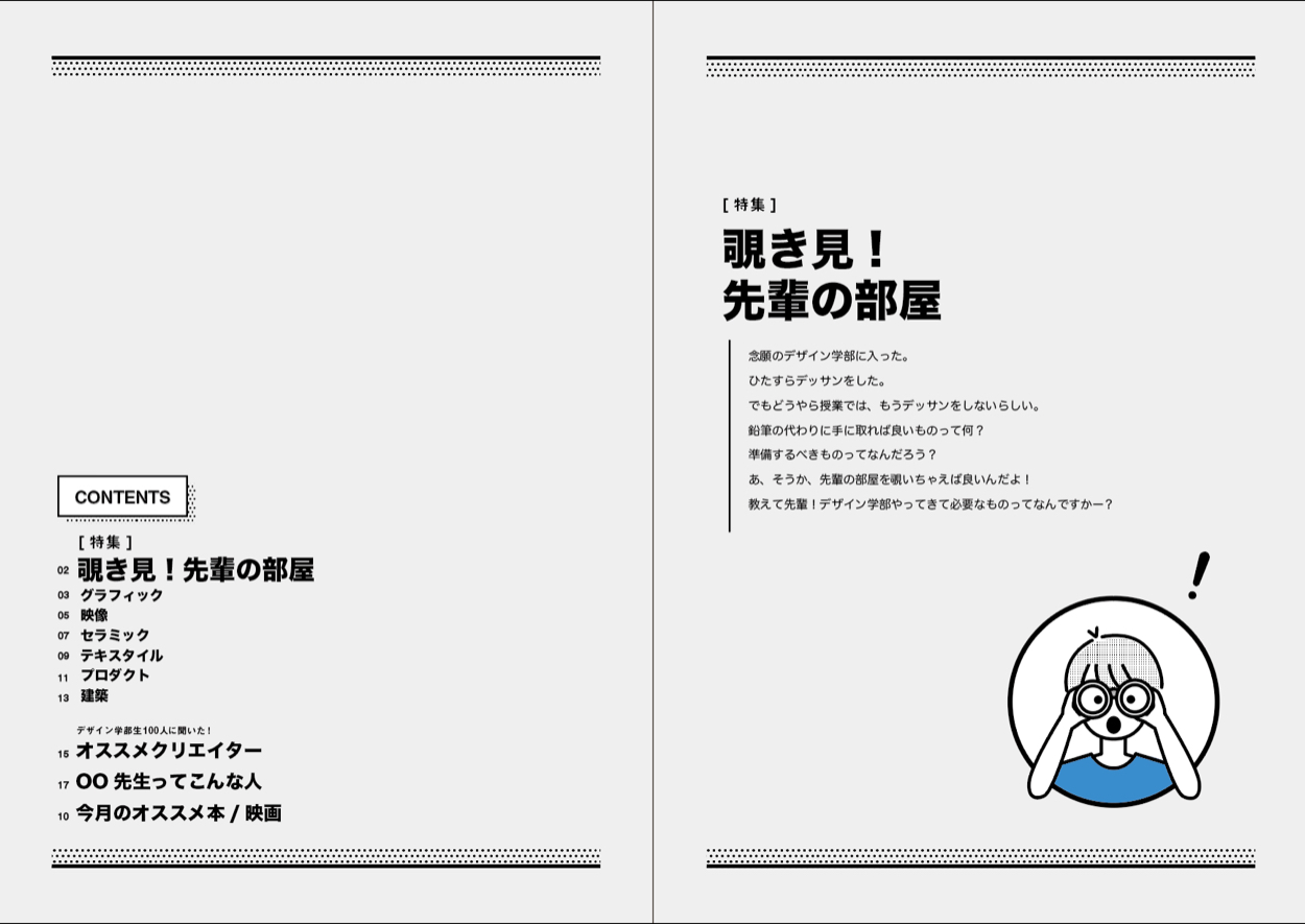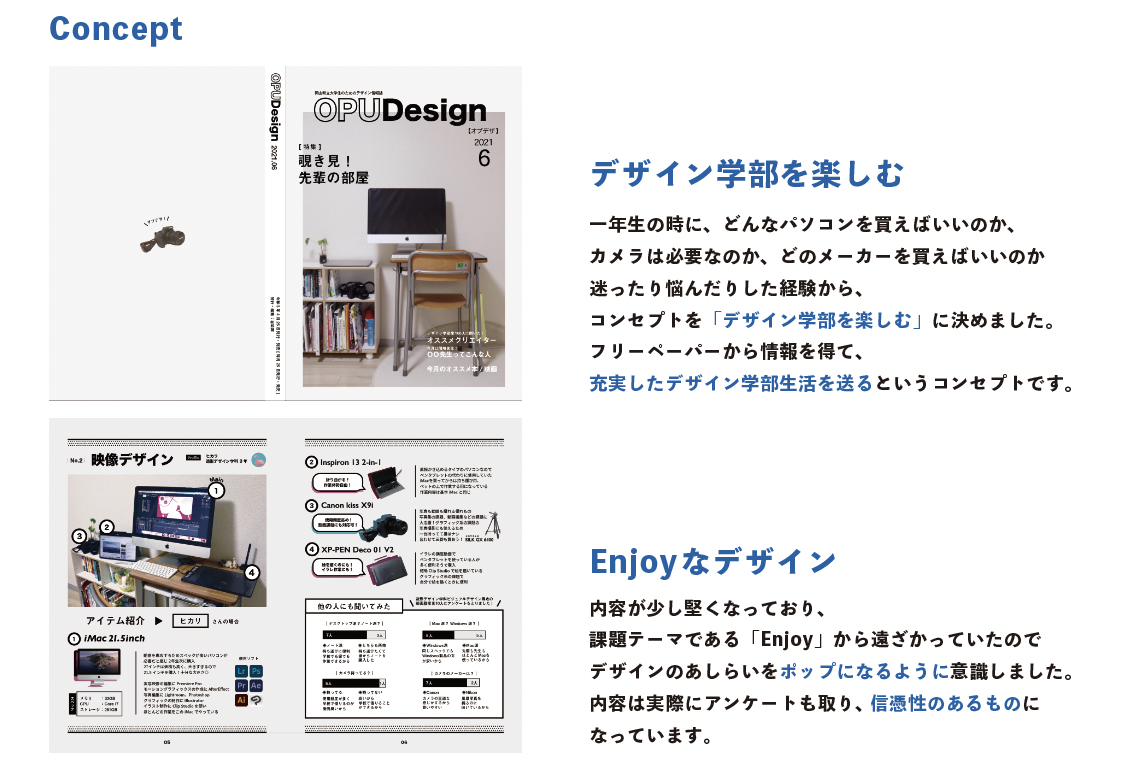 大学課題/フリーペーパー制作 tanigaki 岡山県立大学デザイン学部卒 OVERVIEW 大学2年の時に授業で制作しました。 「enjoy」をテーマにしたフリーペーパー制作の課題です。 A5/中綴じ/20ページ想定 YEAR 2021 企画・写真撮影・アンケート・デザイン・全て自分で行いました。