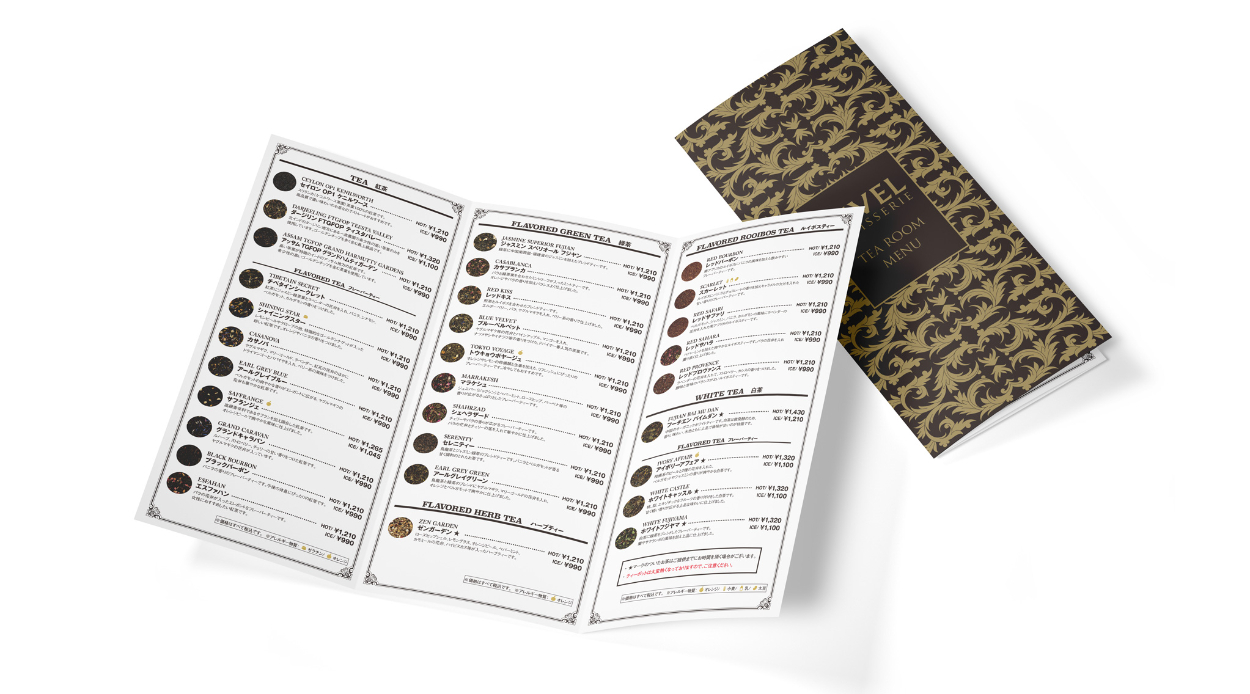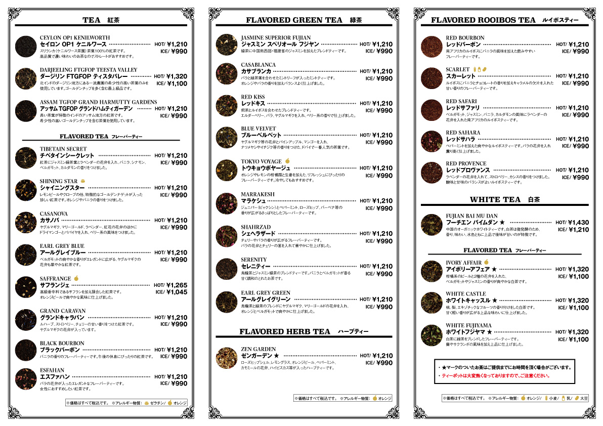 - 中面は紅茶の一覧となっているが、分量が多くレイアウトに苦労した。情報を整理して並び順を考え、ひたすらに「揃えること」を意識してきっちりと仕上げた。