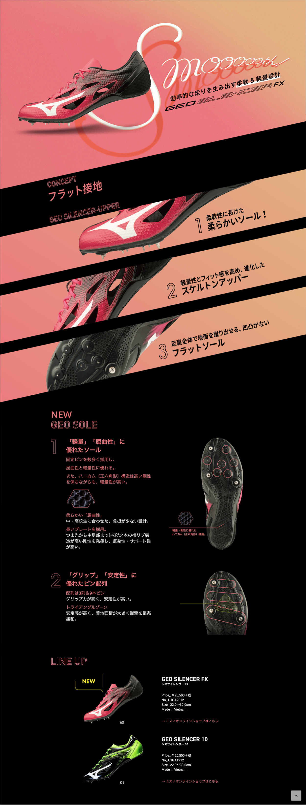 ミズノ GEO SILENCER10ランディングページ sanamaru デザイナー OVERVIEW ミズノ GEO SILENCER10ランディングページ YEAR 2017 ミズノ 「GEO SILENCER10」のランディングページを制作させていただいた。プロダクトからカラーを抽出し、動きのある装飾を行い、エネルギッシュでクールな印象が伝わるデザイン展開を行なった