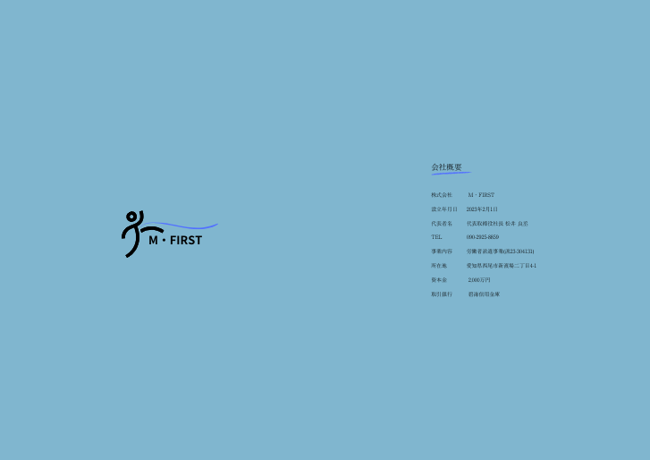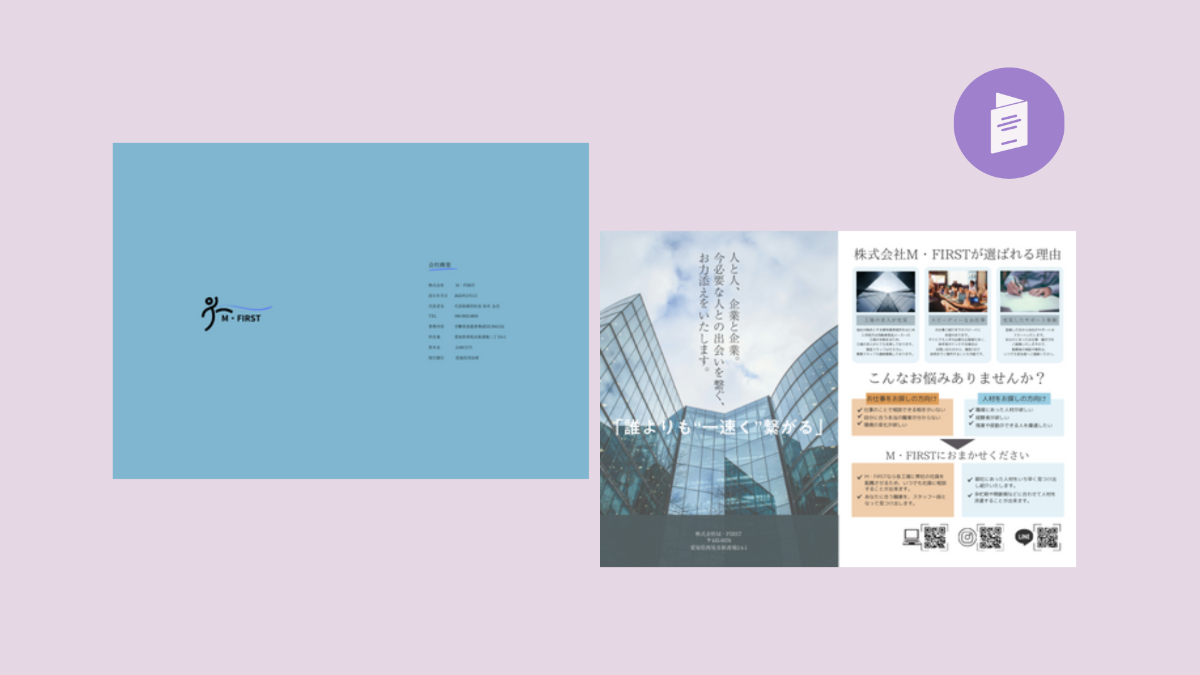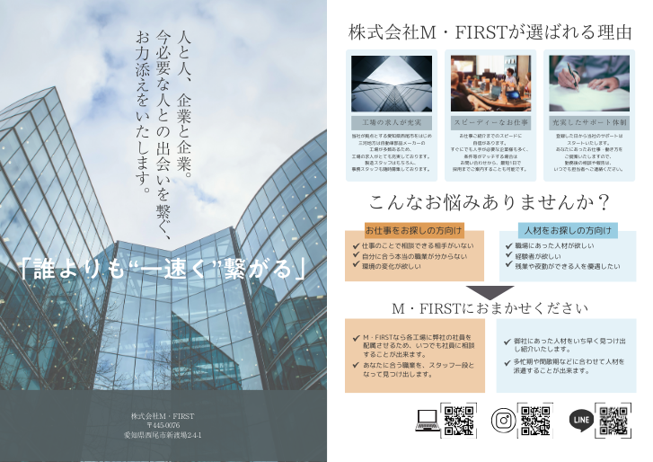 ・左側はM.FIRSTのホームページに記載されていた派遣会社のキャッチコピー、「誰よりも一速く繋がる」を強調したかったので2枚目の真ん中に配置しております。