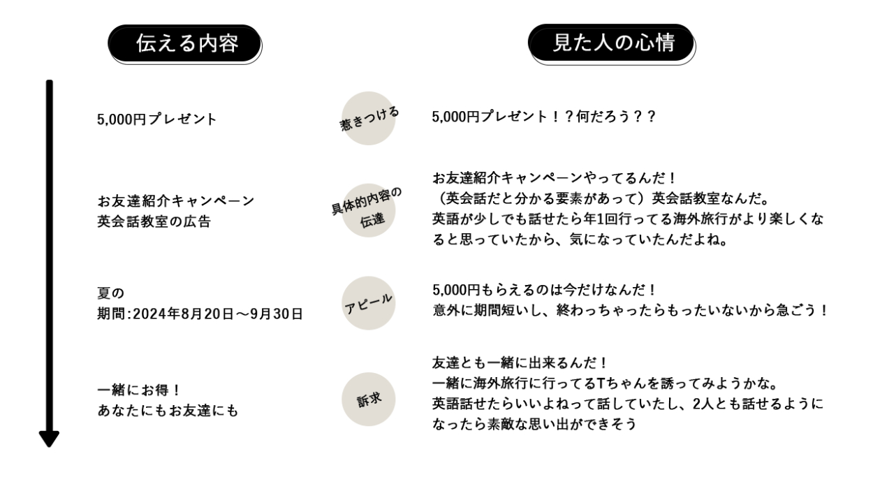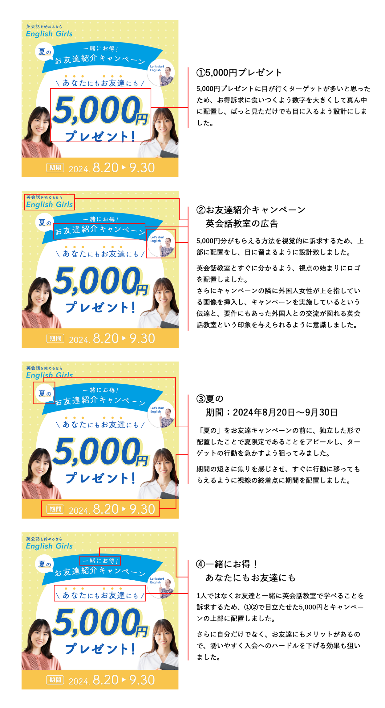 ・「あなたにもお友達にも」部分で背景と同じドットのあしらいと、呼びかけるようなあしらいを配置したことで、読んでもらいやすいように情報をまとめたほか、呼び込んでいる印象を与えてお得な情報があるということを認知させるような効果を出してみました。
