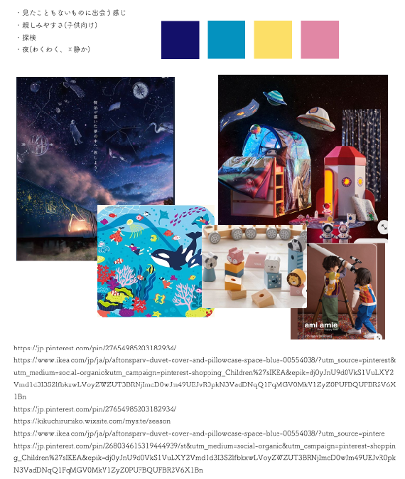 夜の雰囲気を出すために、全体を暗いイメージにしましたが、差し色としてピンクやイエローを使って楽しい・ワクワク感を演出しました。また背景と明暗差が大きいため重要なボタンを目立たせる効果も考えて配色しています。