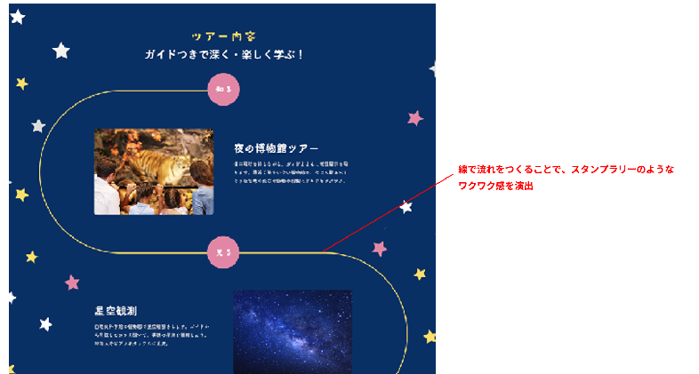 - ツアー内容はただ羅列するだけでなく、デザインで流れをつくることでワクワク感を出しています。