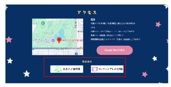 - 夜のツアーなので、それまで子供を別の場所で遊ばせたいという人もいることから、周辺観光案内もアクセスの近くに載せています。
