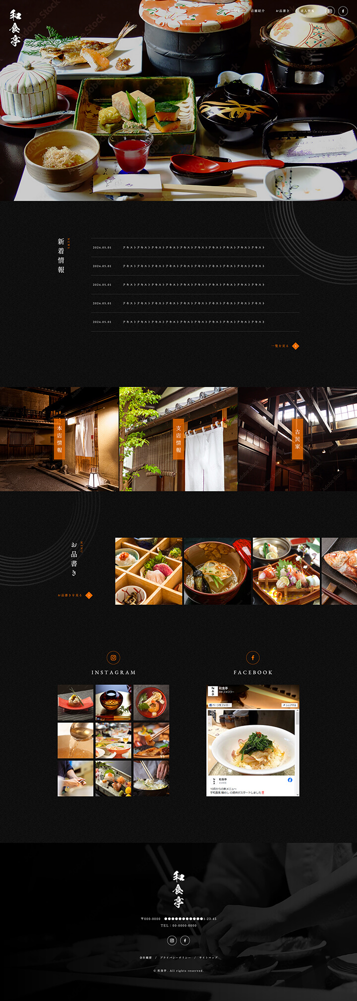 料亭デザインサンプル 彩匠デザイン フリーランスWEBデザイナー OVERVIEW オレンジをポイントで使用し、伝統や歴史が感じられるイメージに仕上げました。 背景を黒で引き締め、高級感を演出しております。 YEAR 2024