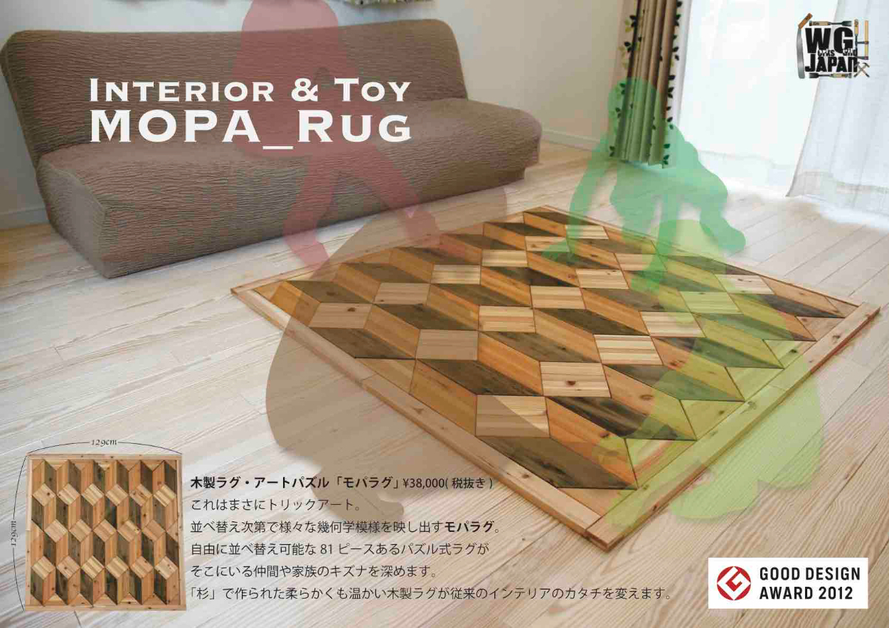 MOPARUG HIDENORI OHNO 大野英憲 デザイナー OVERVIEW 間伐材秋田杉の有効利用・普及・促進させるためのプロダクト 2012年 グッドデザイン賞受賞2012年 キッズデザイン賞受賞床に敷く木製ラグの製作。組み立てが楽しく感じられるインテリア。81ピースの幾何学模様が組み上がるとそれはまさにトリックアートのよう。変化し続けるインテリアとしての提案。 WEBSITE