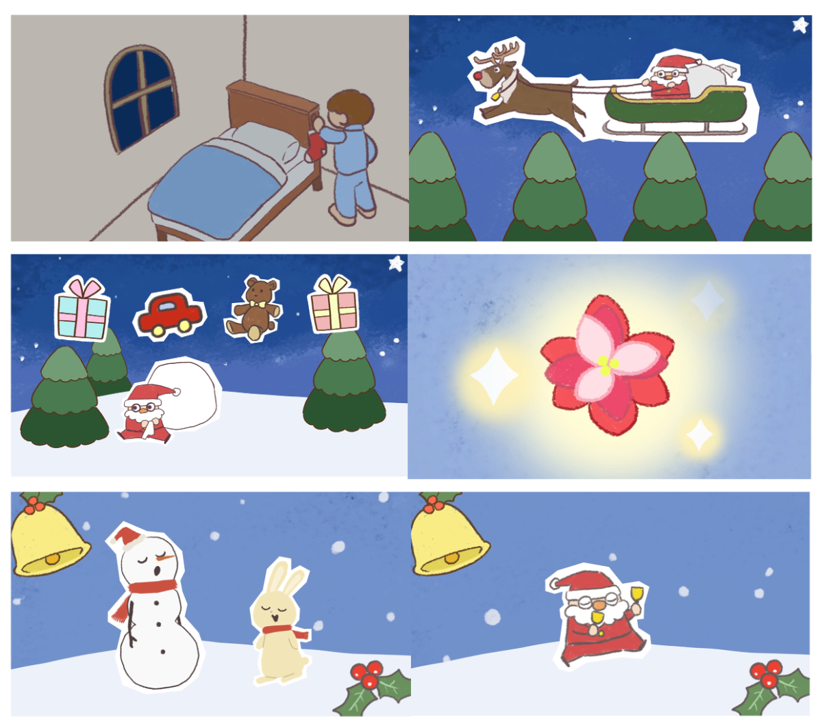 メディア表現演習Ⅱの授業内の課題としてグループで制作したアニメーションです。私はイラストとアニメーションを担当しました。構想や絵コンテは他の学生が担当し、細かく相談しながら制作を進めました。また、同じくイラスト担当の学生と、背景を描いてもらうなど役割分担をし、協力して制作しました。