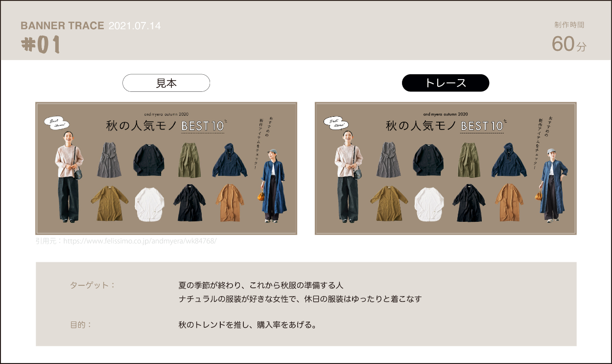 「どうしてそういうデザインになっているのか」を意識しながらトレースしました。写真の配置、文字のフォントや大きさなどを考えることによって「伝えたいことが変わってくる」と気付かされました。