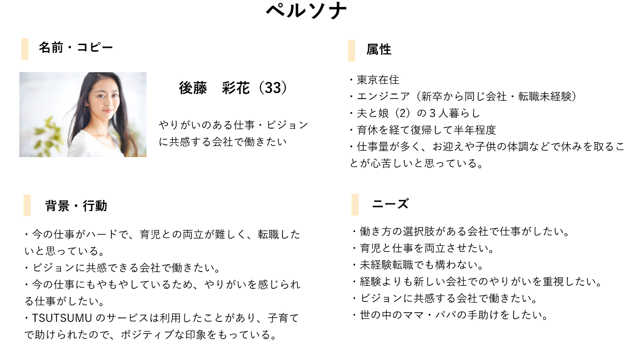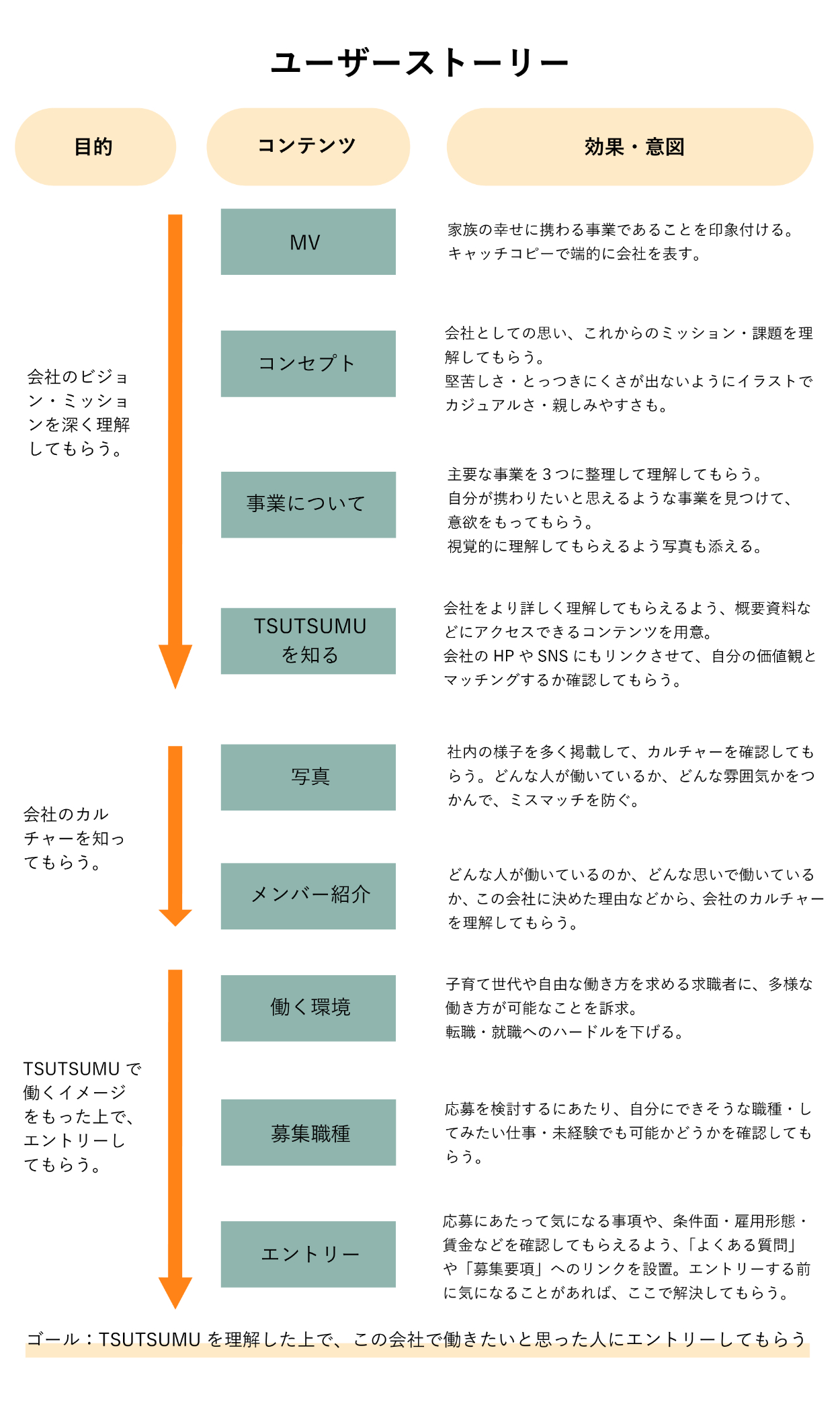 実際に転職者の立場に立ち、どのような情報が欲しいか、どのような情報があればエントリーしてみようと思うか、また今回のゴールであるカルチャーフィットする人材が入社するためのユーザーストーリーを作成し分析しました。それをもとに実際にどんな人がどんな雰囲気で働いているかが分かる写真を多く載せたり、社員の1日などのコンテンツやSNSへのリンクを設置するなどの工夫をしました。