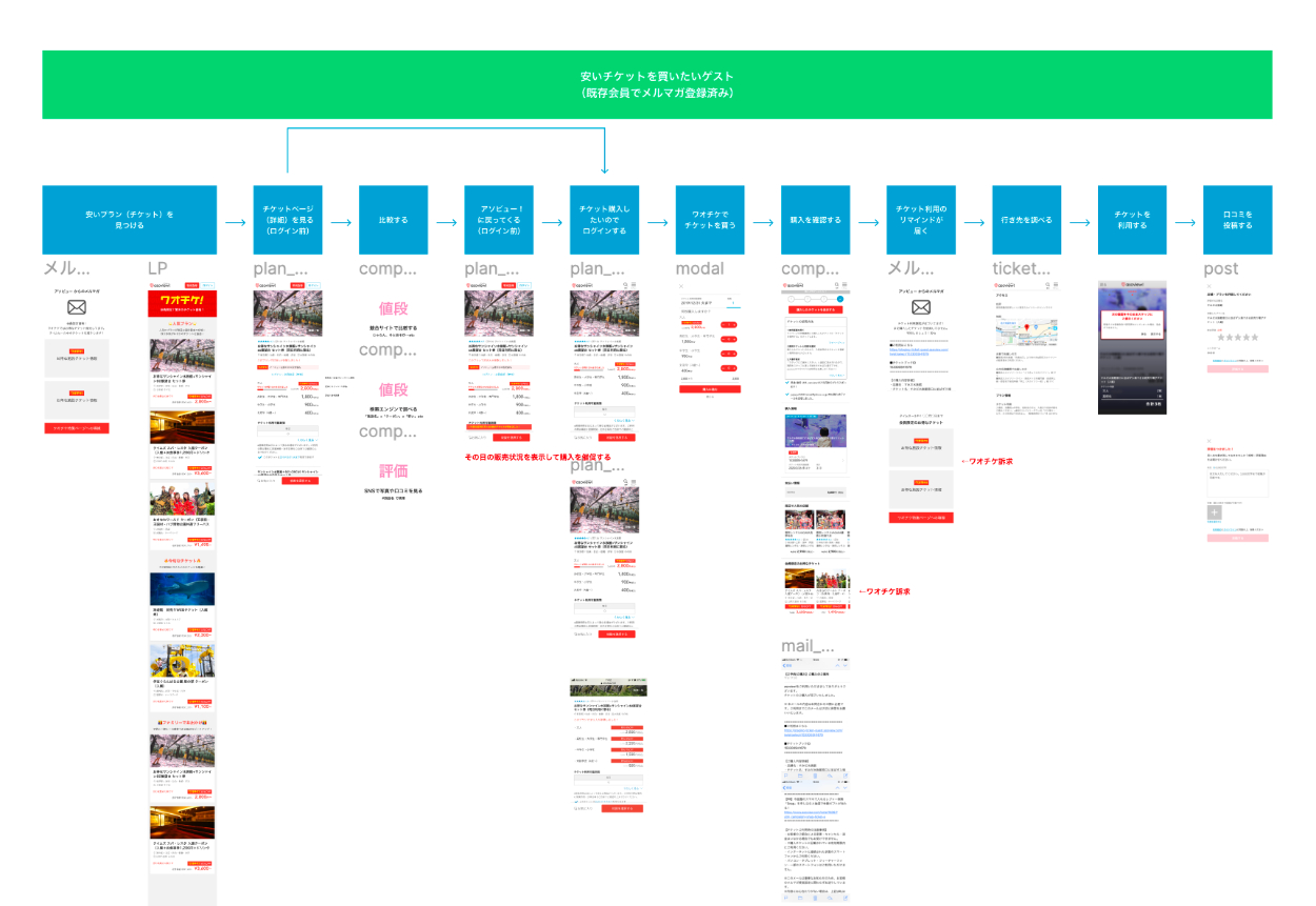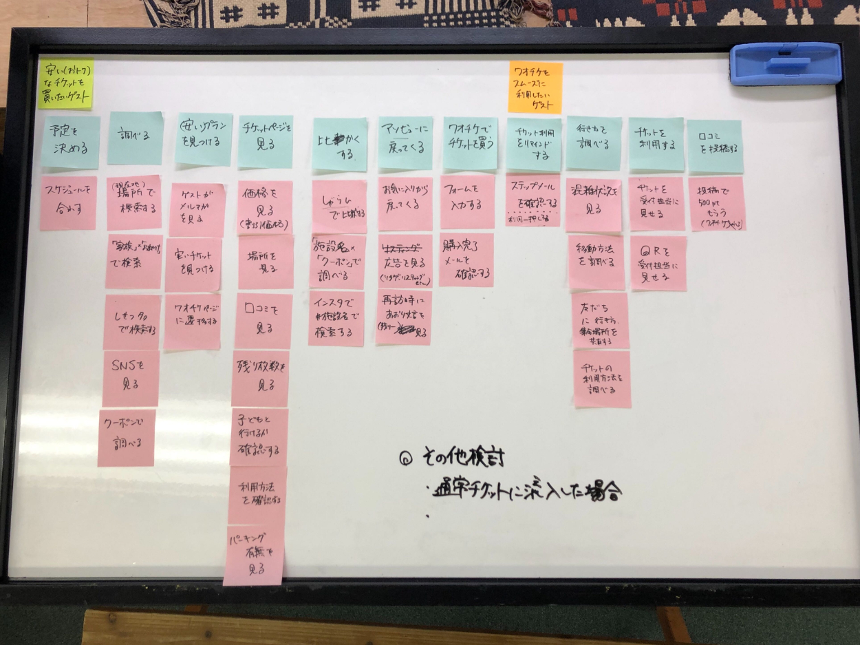プロジェクトメンバーを集めて初稿デザインを叩きにディスカッション。ここでサービス名が「ワオチケ!」に決定しました。
