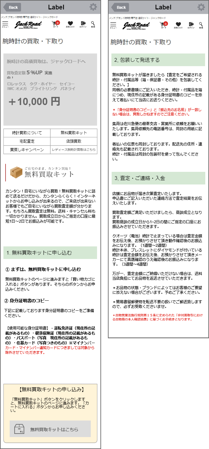 買取のトップページのリニューアルに伴い、下層ページとして「買取キット」「宅配査定」「店頭買取」の詳細ページがスマホ対応になっていなかったのでスマホ対応させる事になりました。