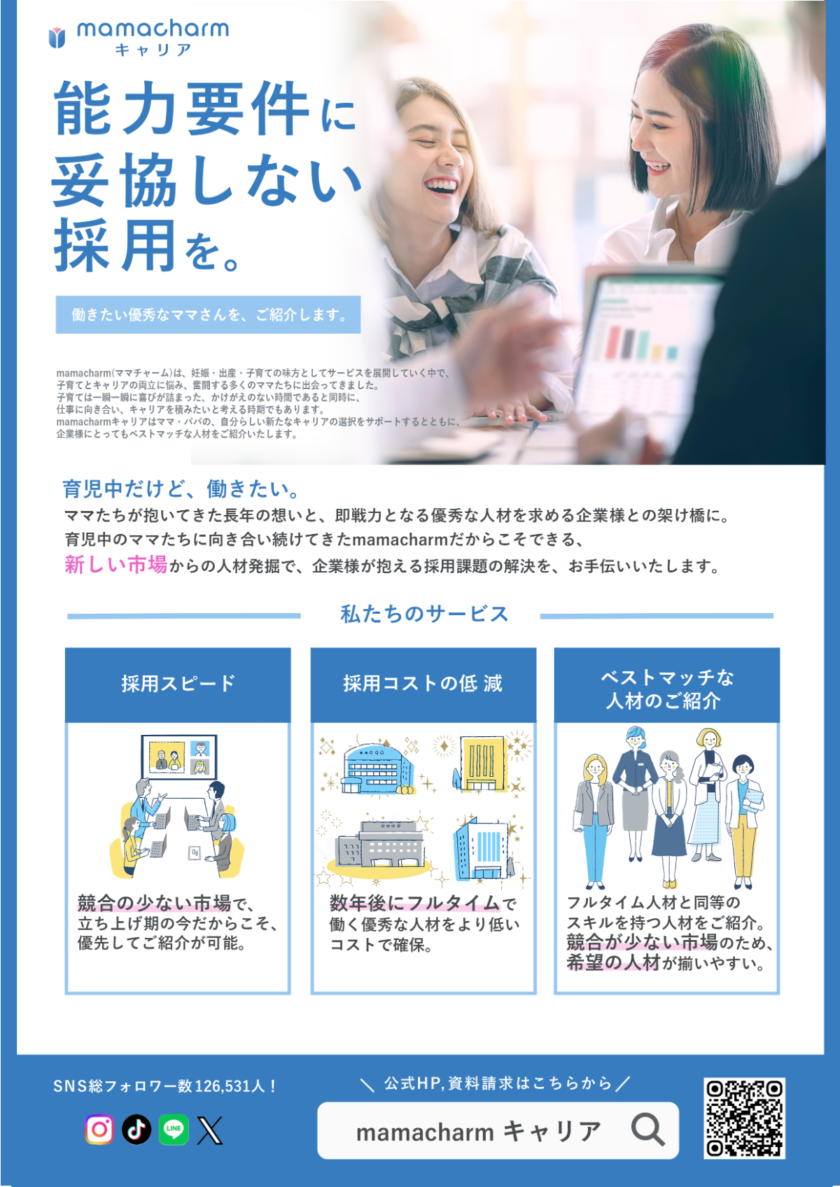 mamacharm キャリア様 フライヤー Nagi フリーランスWebデザイナー OVERVIEW 法人様のお客様向けたフライヤーを作成いたしました。 YEAR 2024 mamacharm キャリア様 法人向けフライヤー