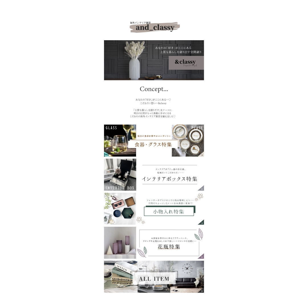 海外雑貨をメインに販売されております&classy様の楽天サイトデザイン制作をさせて頂きました。compass for 楽天市場を使用してのデザイン制作となります。
