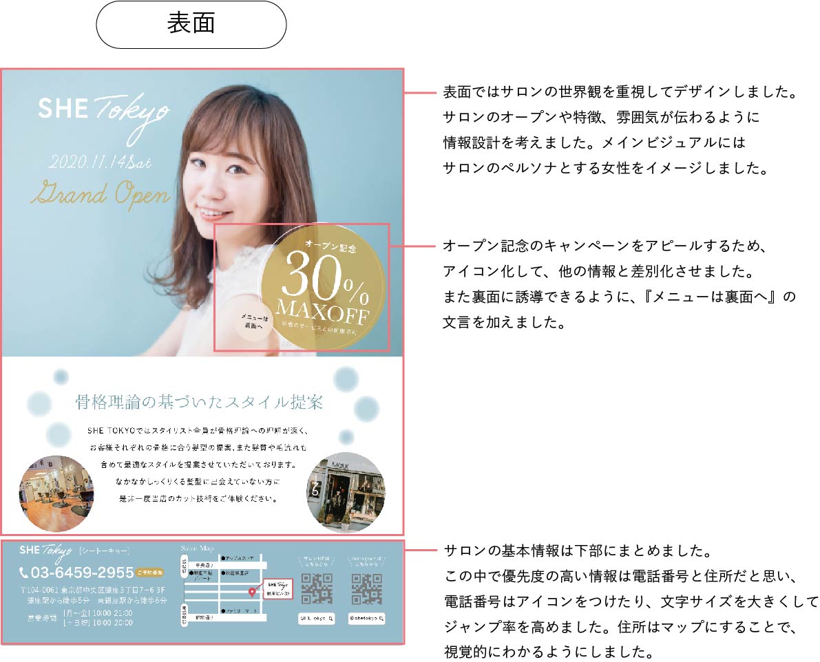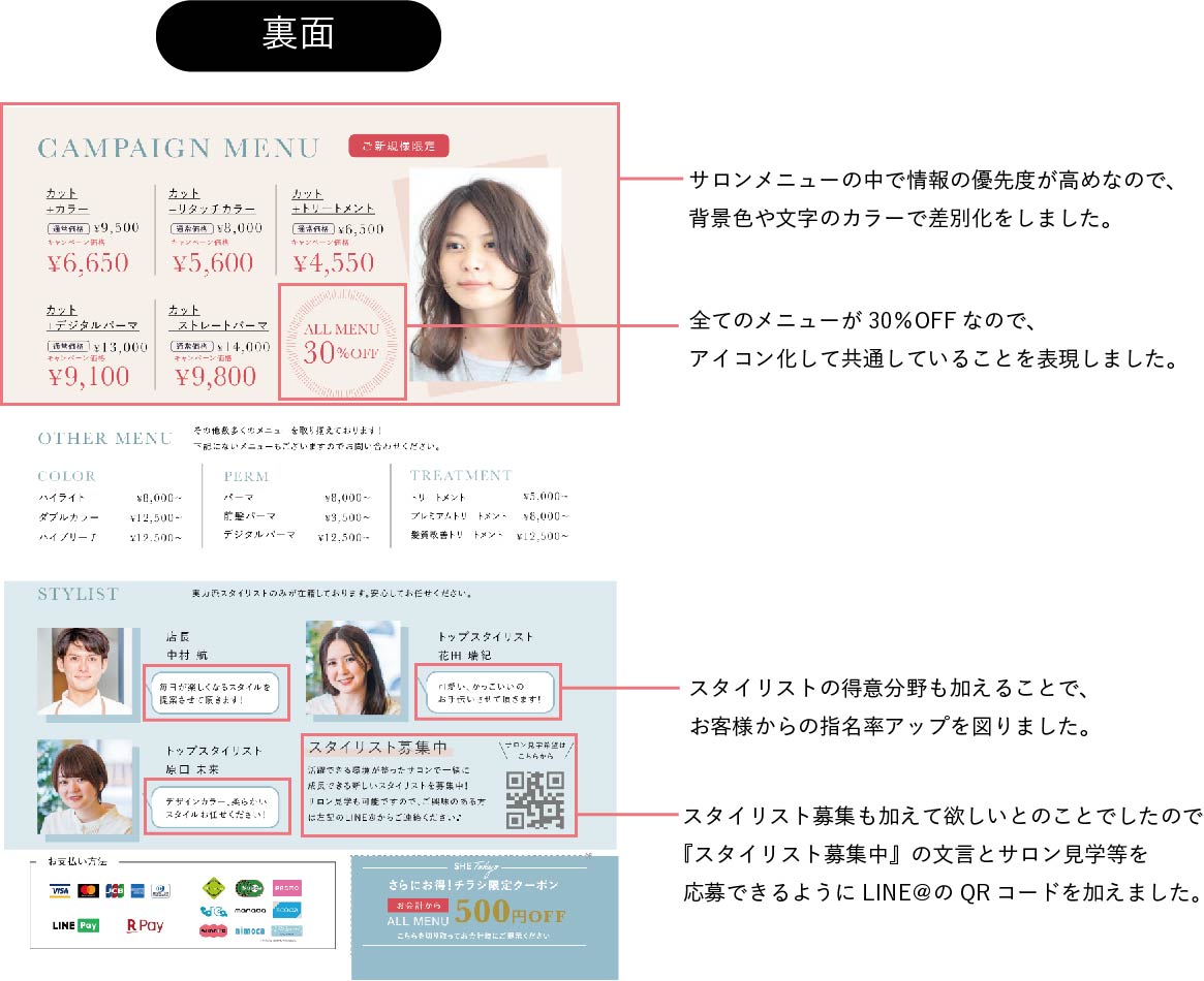 優先した情報としては『ヘアサロンのオープン』・『サロンのキャンペーン』の2点を重要視しました。表面と裏面で訴求ポイントを分けています。