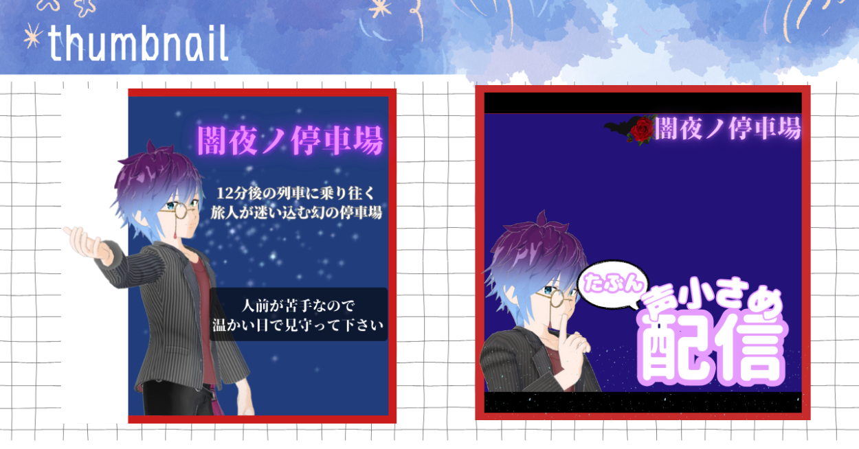 暗めの配色でどういった配信かというのを押し出した形の右。左は性質を伝える形でのサムネイルになっています。ページトップの背景にもよりますが、同色で繋ぐと飛び出しているように見えなくもないデザインになっています。