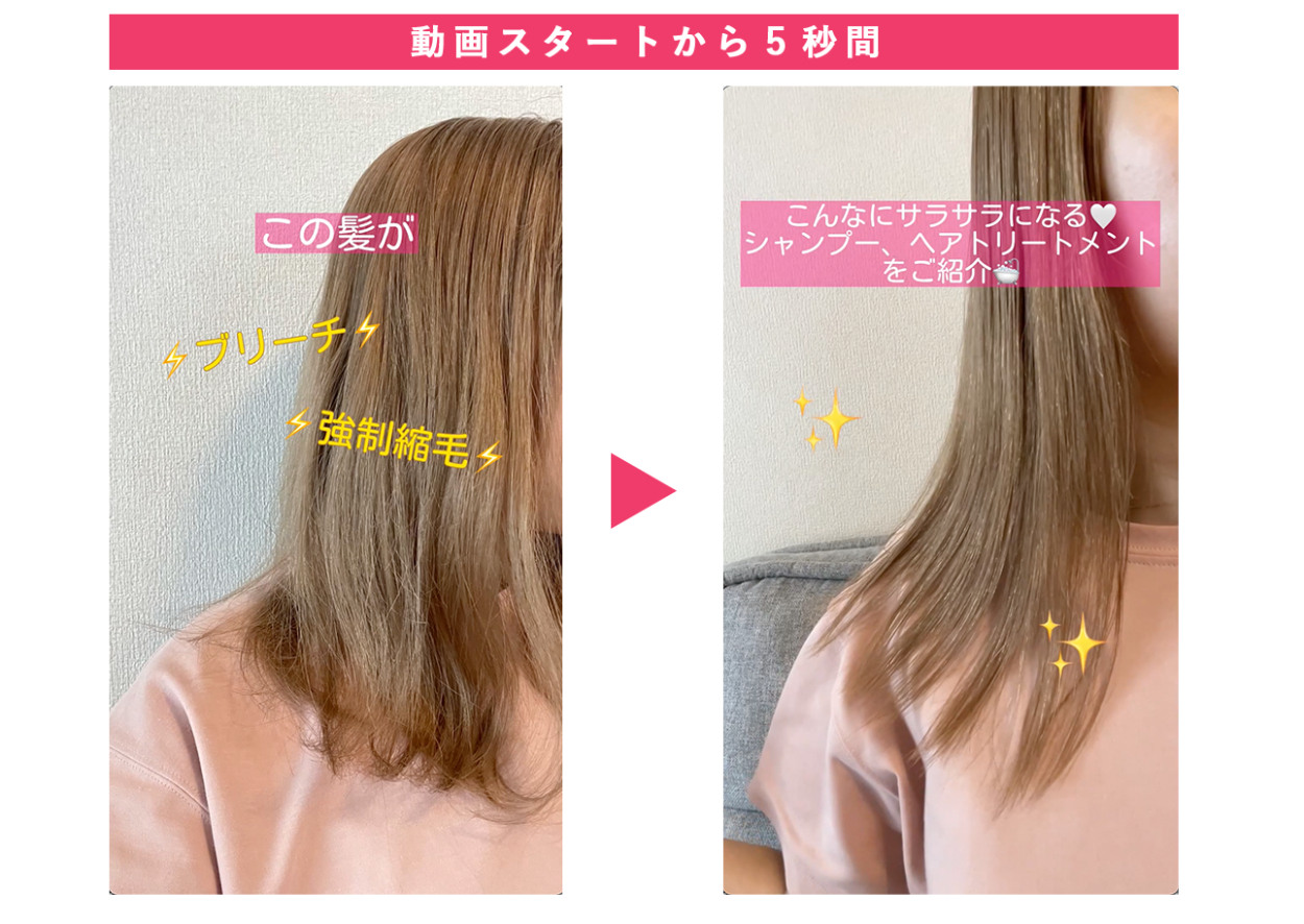 ユーザーの興味を引き動画を最後まで見てもらうため、動画スタートから5秒間でシャンプー使用のBefore/Afterを見せました。