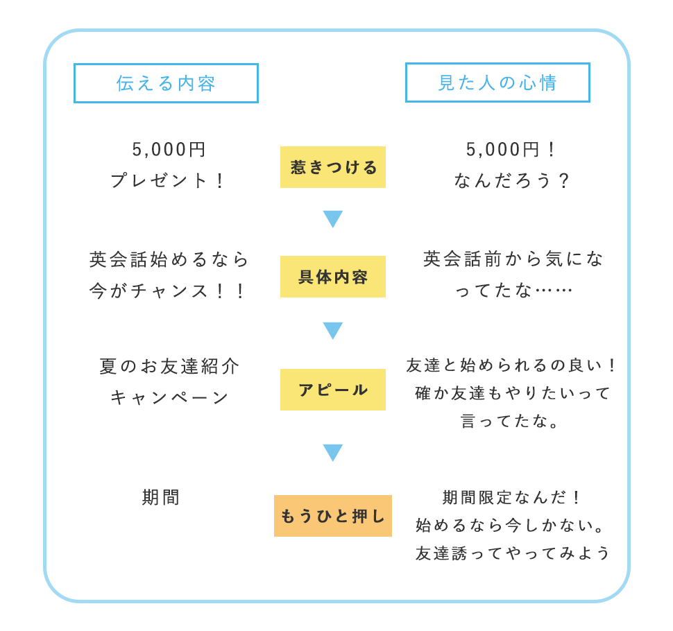 ・「Zの法則」の視線の流れを意識し、最初の段階で英会話教室の案内であることを明示しました。また、「今がチャンス」という文言を一緒に配置することで視線を惹きつけ、ユーザーの離脱を抑えることを意識しました。