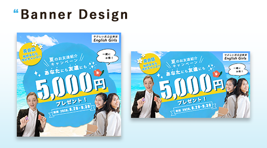 SHElikes MULTI CREATOR COURSEにて、架空の英会話教室のキャンペーン告知についてバナー制作を行いました。クライアントからの要件定義書をもとに、目的に沿った情報設計とビジュアルデザインを行いました。