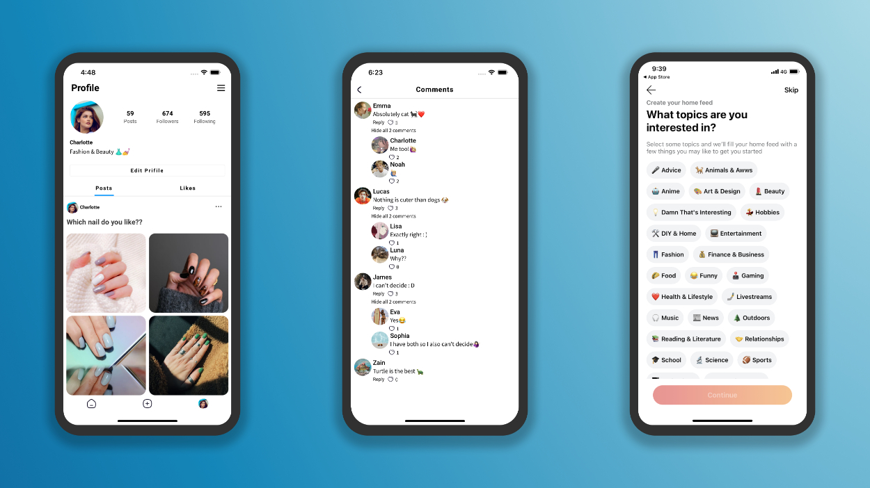 主な機能: チャット、投票、画像投稿、ユーザー作成、SNSの一般的な機能