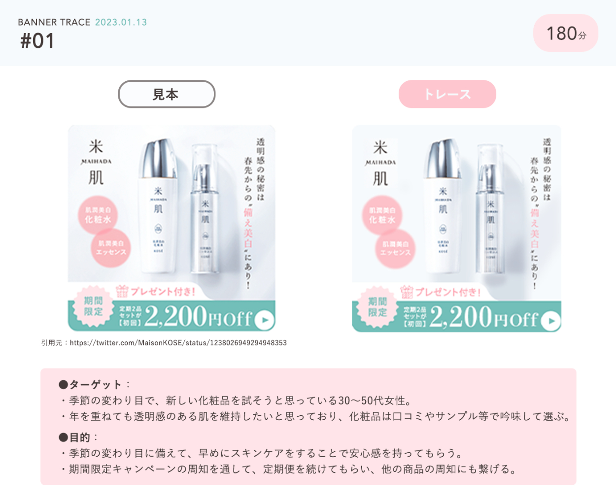 初回定期便キャンペーンや、キャッチコピーの「春先からの備え」という文言から、季節の変わり目で新しい化粧品を試そうとしている女性をターゲットに設定しました。