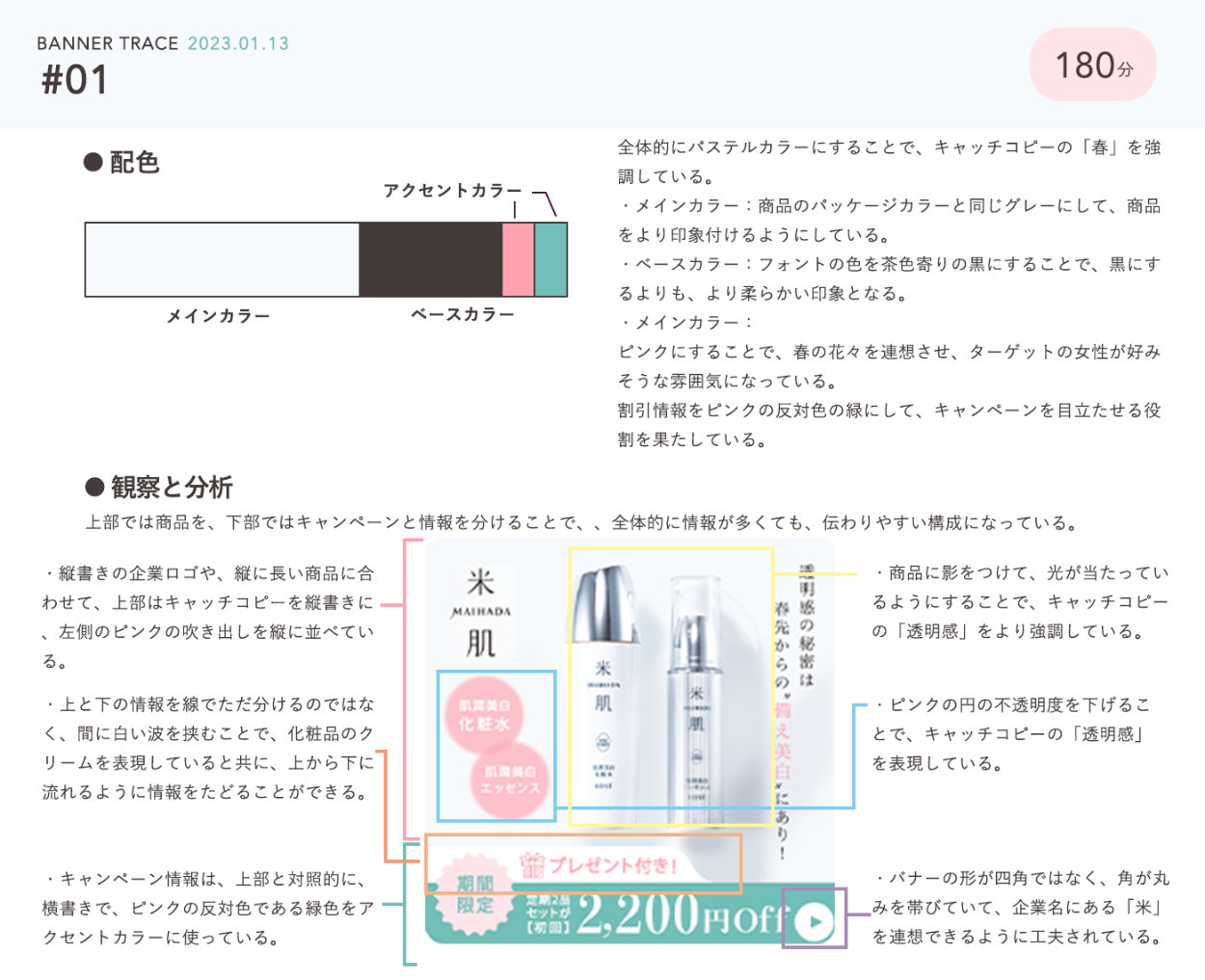 SHElikes MULTI CREATOR PROJECTにて、バナートレース課題に取り組みました。 また、「ターゲット」「目的」「配色」等についての分析結果もまとめました。