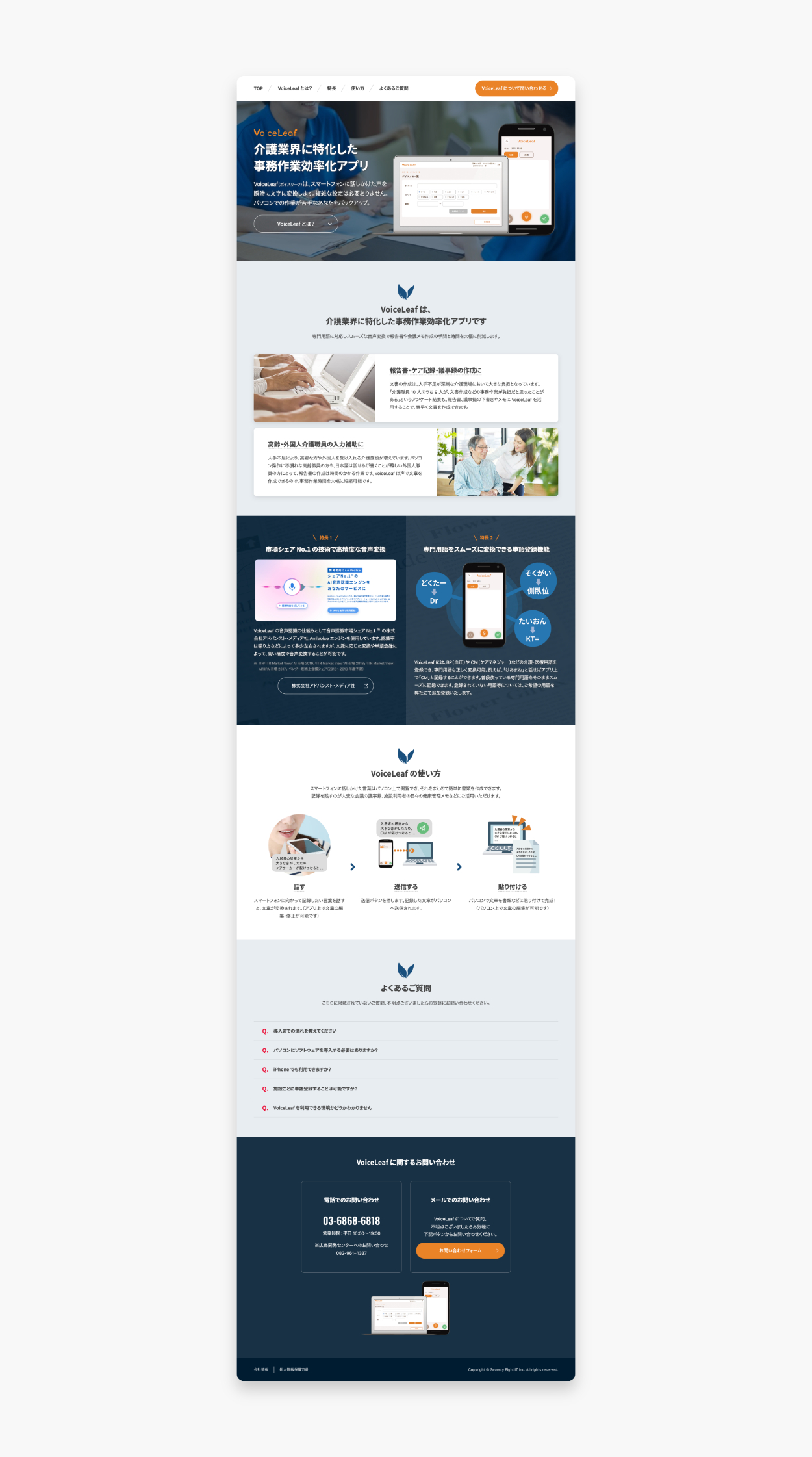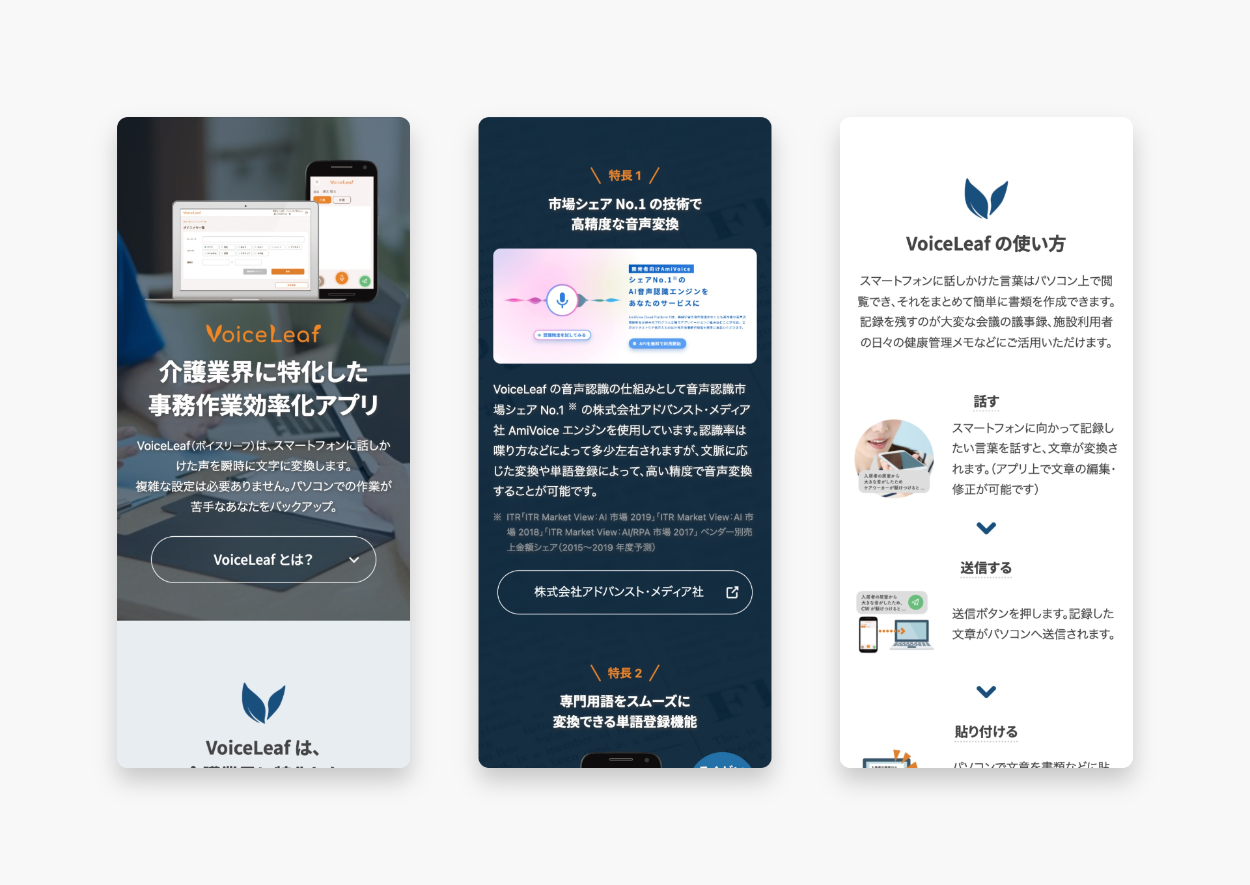 VoiceLeaf(ボイスリーフ)は、介護業界向けの音声認識技術を使った事務作業効率化アプリです。音声認識技術は、高齢な方や日本語が不自由な外国人の方など、パソコンで文字を入力するのが難しい人には非常に便利なものです。その音声認識技術を介護業界に活かせないか、という発想から生まれました。私は、VoiceLeaf の魅力や使い方を伝えるためのパンフレットと LP のデザイン制作を担当しました。