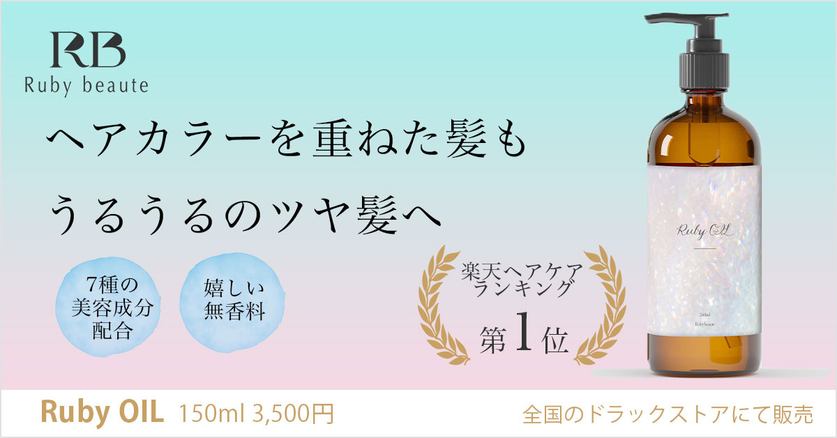 Ruby OILはヘアカラーを楽しむ方のお悩みに寄り添ったヘアオイルとして開発されました。 ヘアカラーで傷んだ髪のパサつきを、潤いのある滑らかなツヤ髪へ導きます。 保湿美容成分を7種類配合しており、傷みのケアはもちろん、カラーの色持ちも良くしてくれます。 普段の生活やリラックスタイムにも気にならない無香料。 販売場所:全国のドラッグストア、量販店、楽天 価格:150ml 3,500円