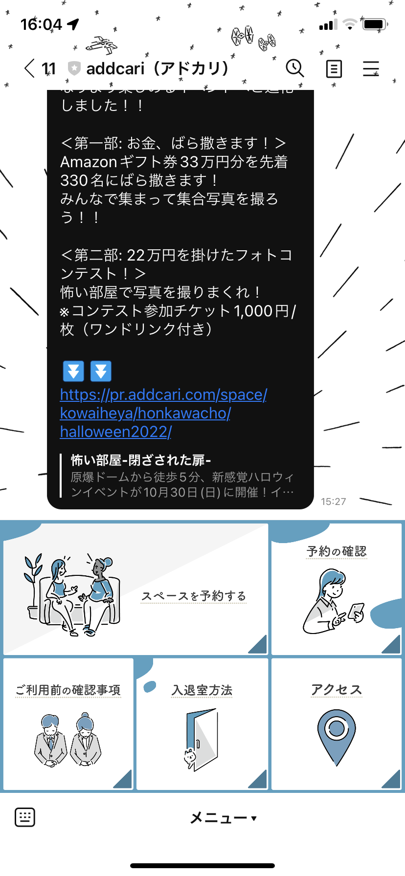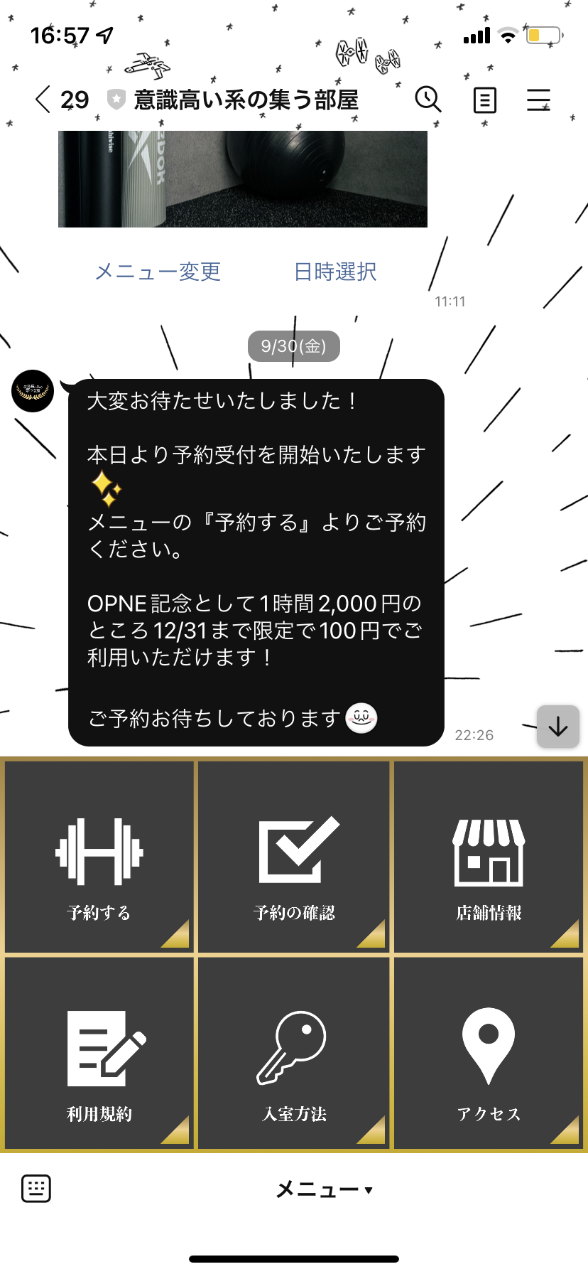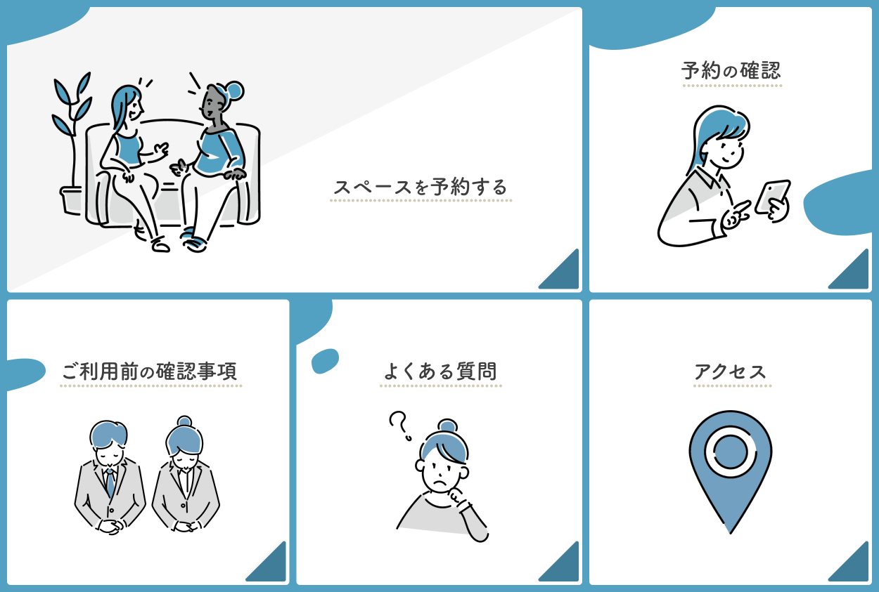 LINEリッチメニュー saki tatsumi デザイナー OVERVIEW レンタルスペースのLINE公式アカウントのリッチメニューを作成しました。 YEAR 2022 リッチメニューデザイン(レンタルスペース)制作時期:2022年9月工数:1Hリッチメニューデザイン(無人ジム)制作時期:2022年10月工数:1H