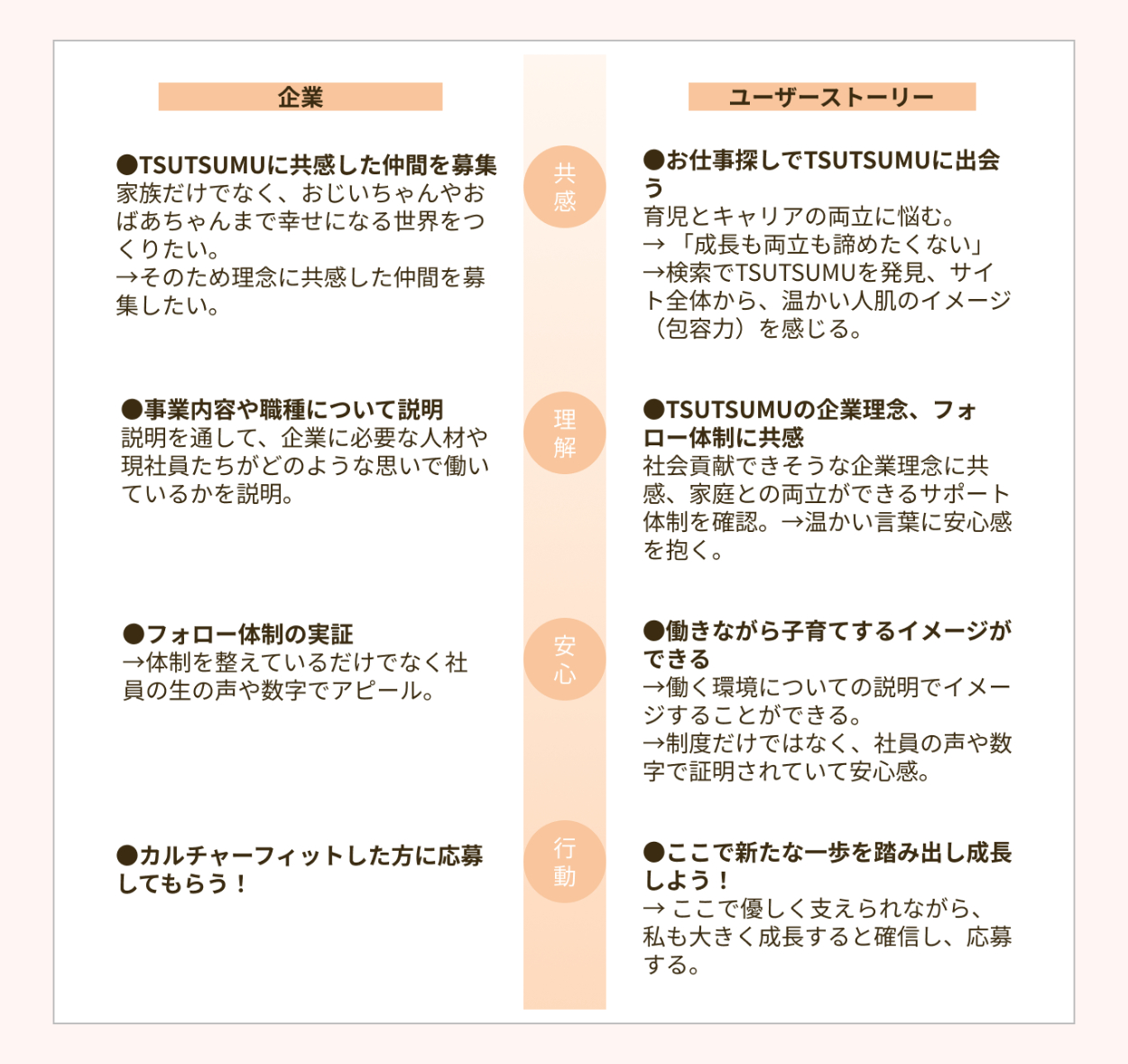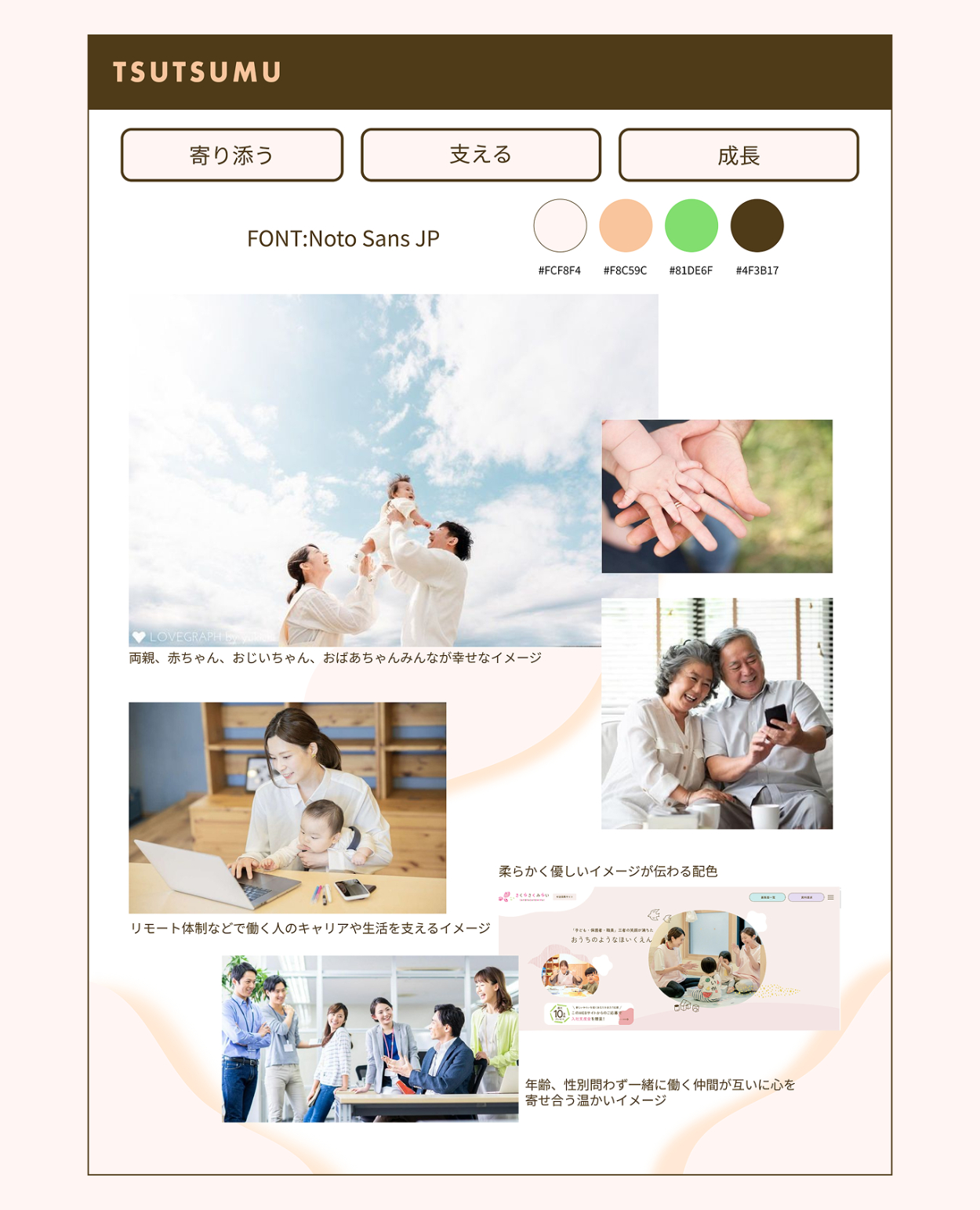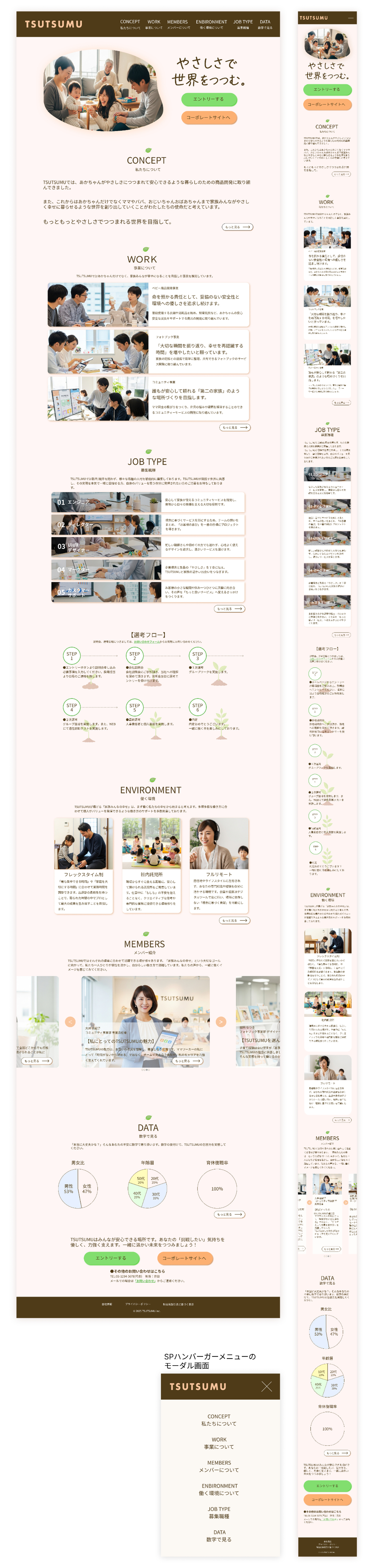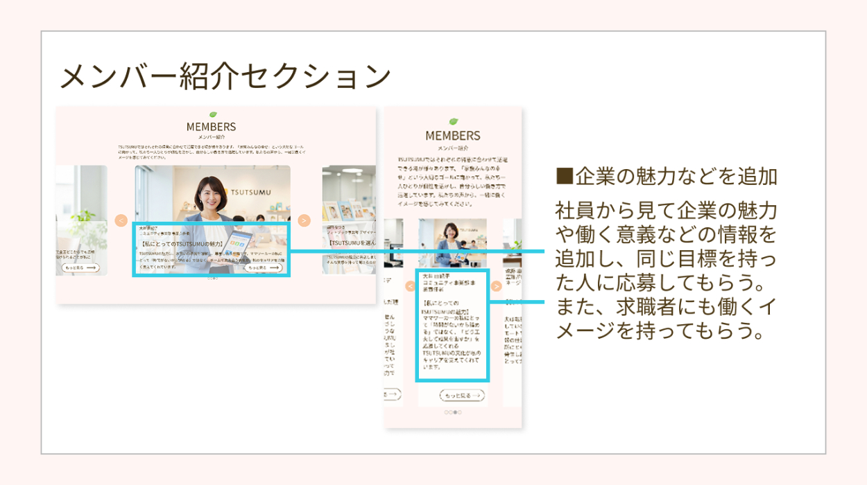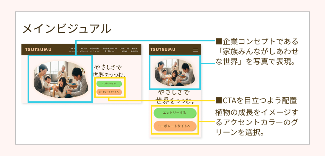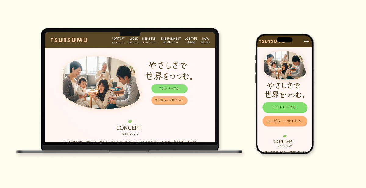 ・企業名である「TSUTSUMU」の言葉通り、サイト全体を優しさで包み込むイメージにするため背景色は一色で統一し、セクションごとの切り替えを分かりやすくするためセクションタイトル上部に成長の意味で葉っぱを配置しました。