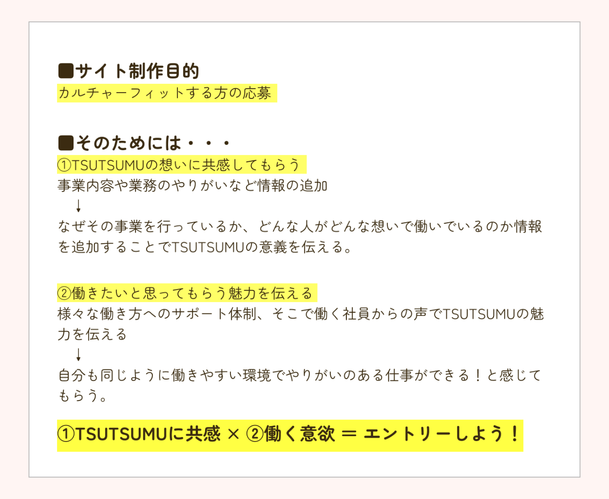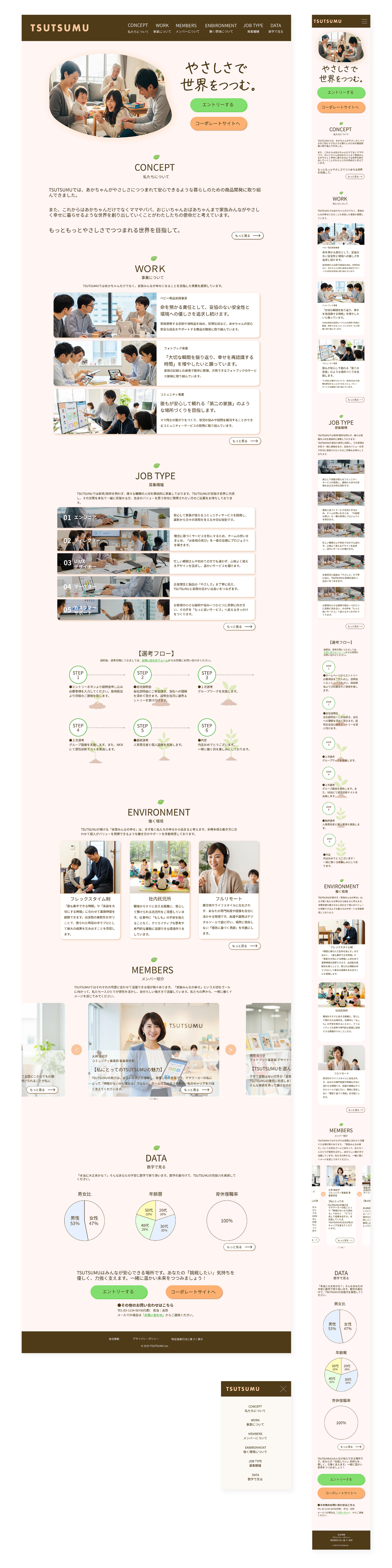 TSUTSUMU株式会社様の採用サイトを制作しました。カルチャーフィットした方の応募が目的なので事業の意義、やりがいなどの情報を追加。働きたい!と思ってもらえるよう社員からみて企業の魅力や働きやすい環境であることが伝わる情報設計を心がけました。