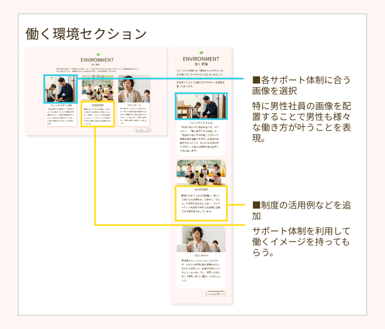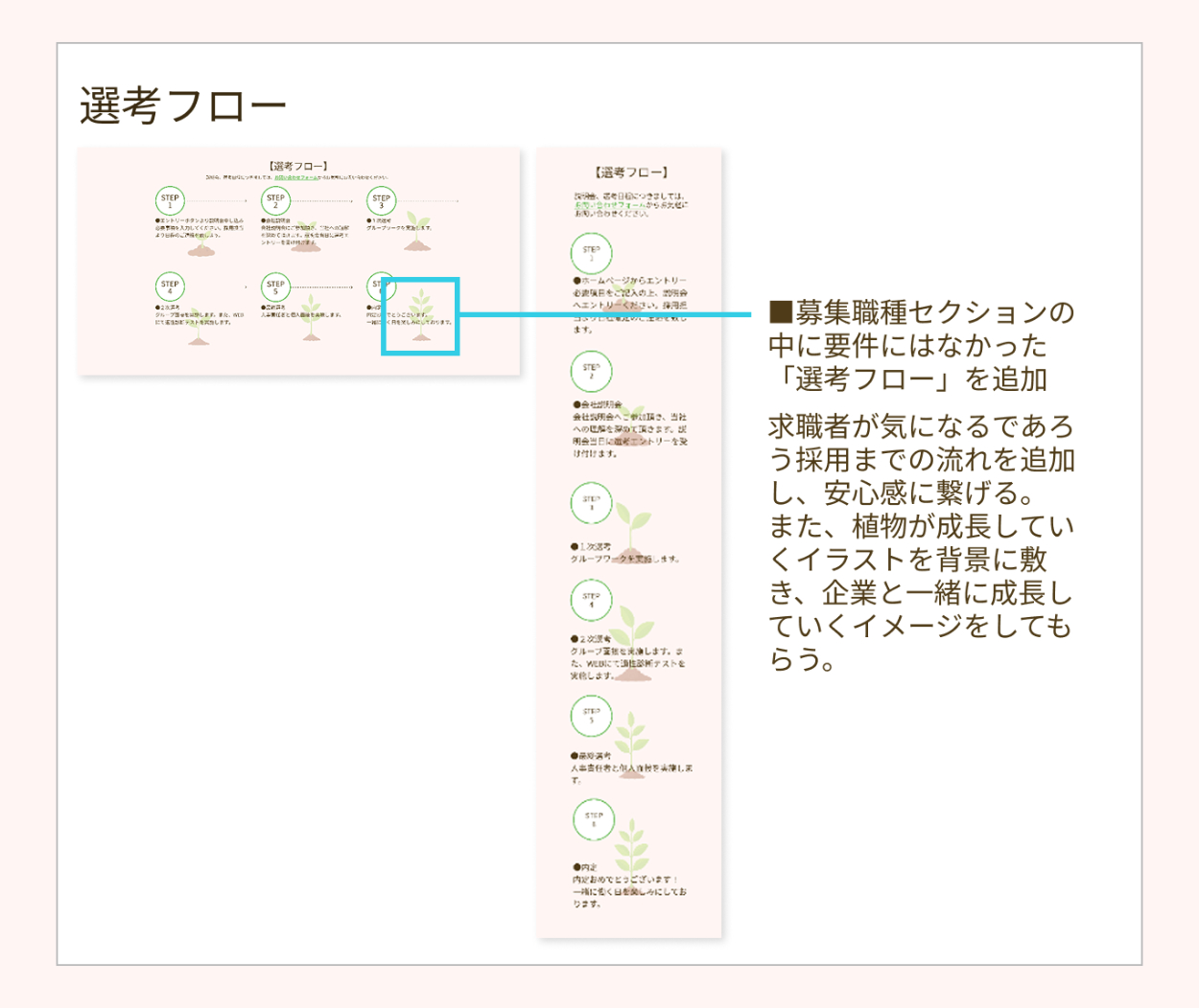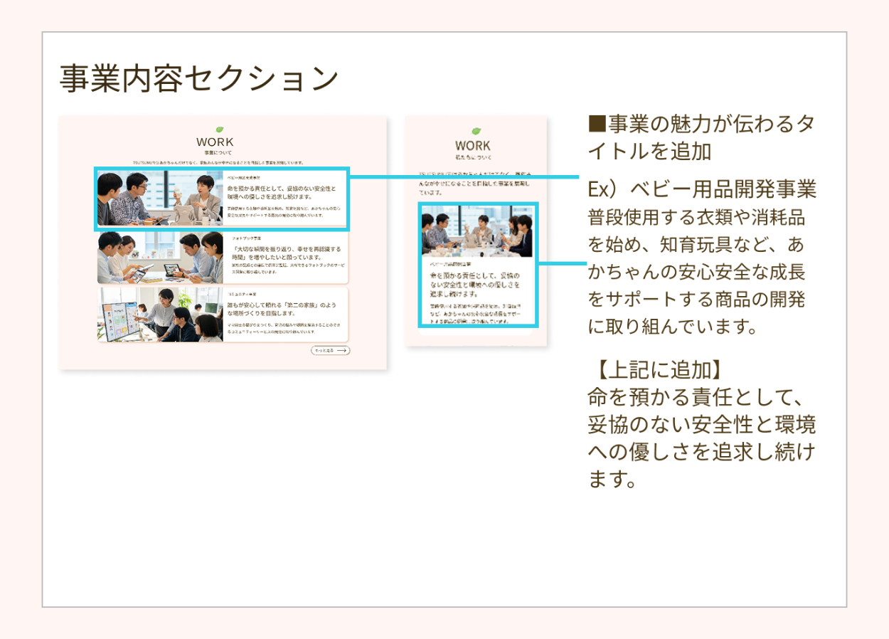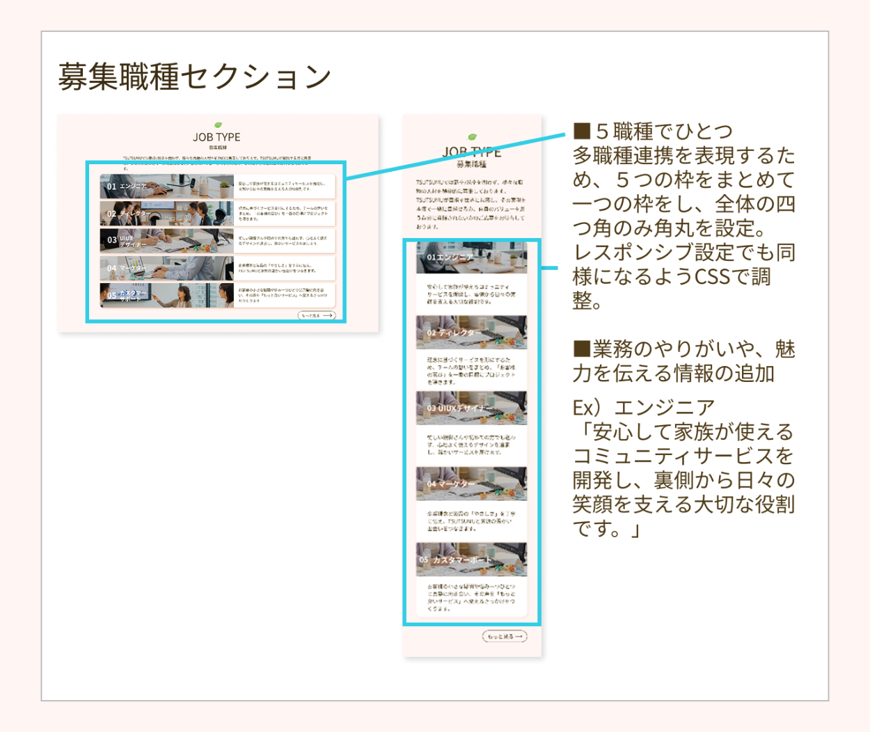 ・企業コンセプトに共感した方に応募してほしいとのことだったので、頂いた要件書より情報量を増やしました。そして詳細情報に画面遷移しなくても全セクションに企業の想いや働きやすい環境ということが分かる情報を多めに載せることで、企業コンセプトに共感した方がエントリーしてくださると考えました。