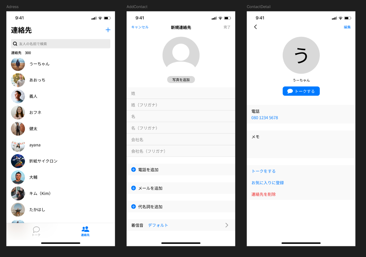 以下は連絡先の一覧と、新規連絡先の登録画面、および連絡先の詳細。