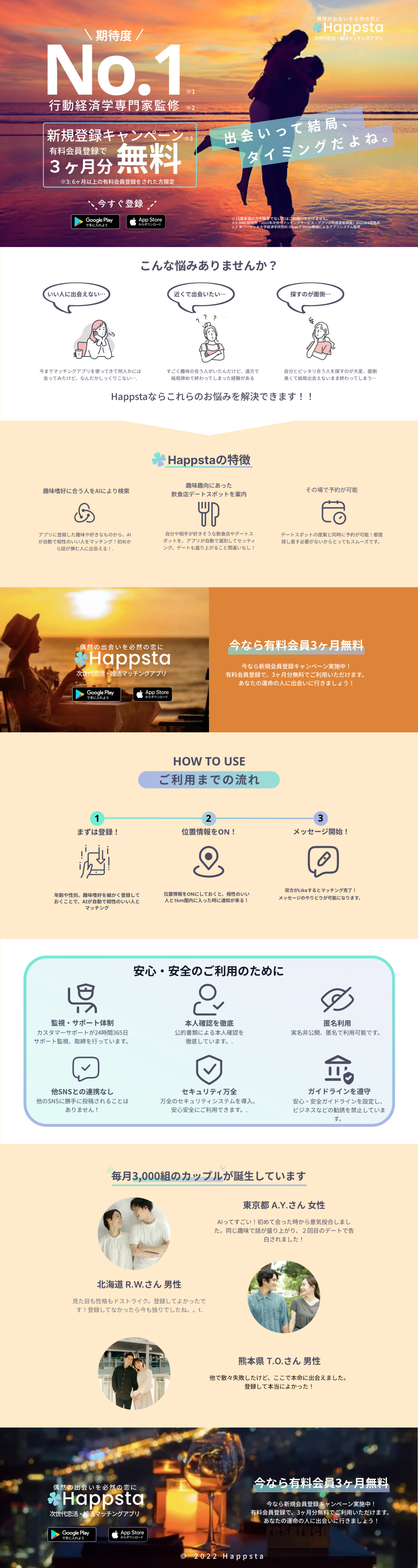 【LP】仮想マッチングアプリ mototsugu Webデザイナー OVERVIEW 20代の男女をターゲットにカジュアルな出会いを提供するサービスを想定して作成した。 若く情熱的・おしゃれな恋愛をストーリー仕立てで表現することで、閲覧者を飽きさせずサービス利用後のイメージを明確化した。 YEAR 2023