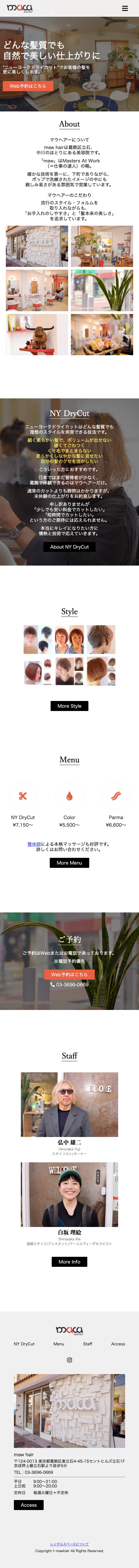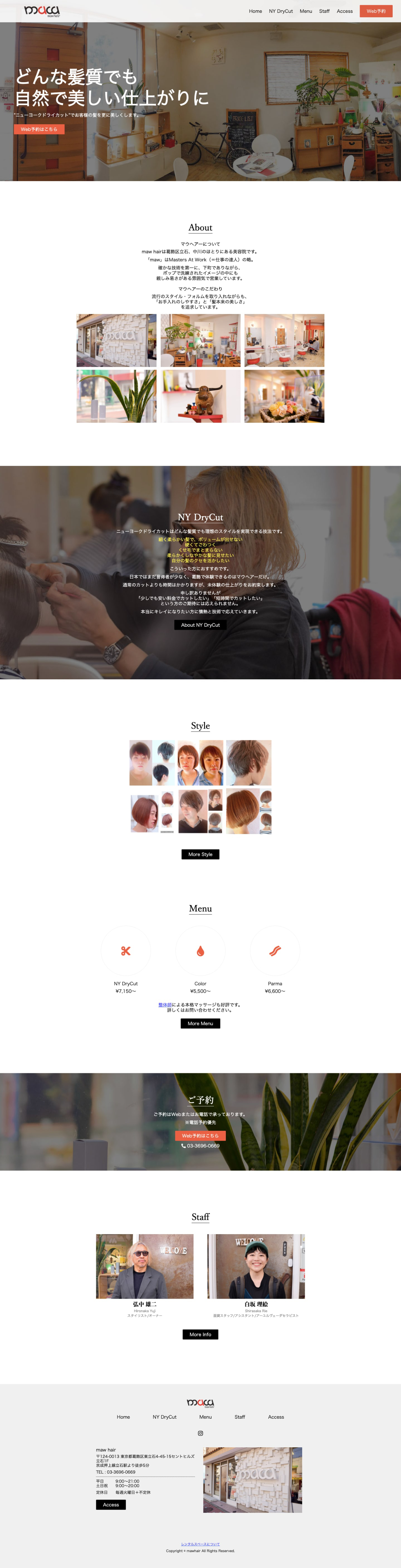 「来店前にニューヨークドライカットの価値を知っていただきたい」というご要望から制作した美容院ホームページ。明るくポップかつシンプルなお店の雰囲気を表現しました。また、PC操作は苦手というクライアントのためにInstagram連携で更新可能にしました。初案件。