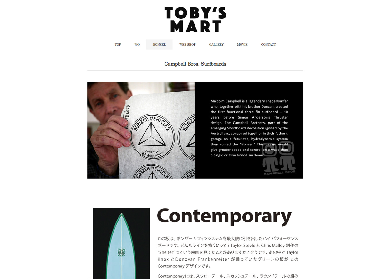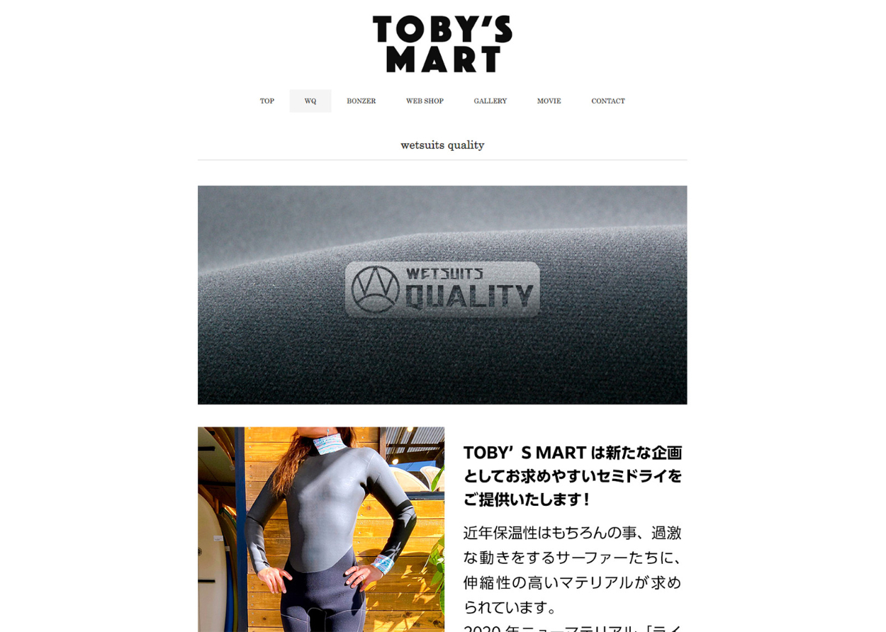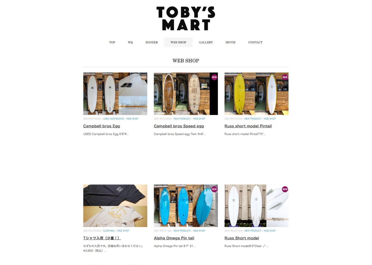 WEBサイト制作管理 H. Hiroyasu Art Director | Designer OVERVIEW サーフショップサイト管理[TOBY’S MART様] YEAR 2020 ホームページの制作管理をさせていただきました。□WordPress WEBSITE