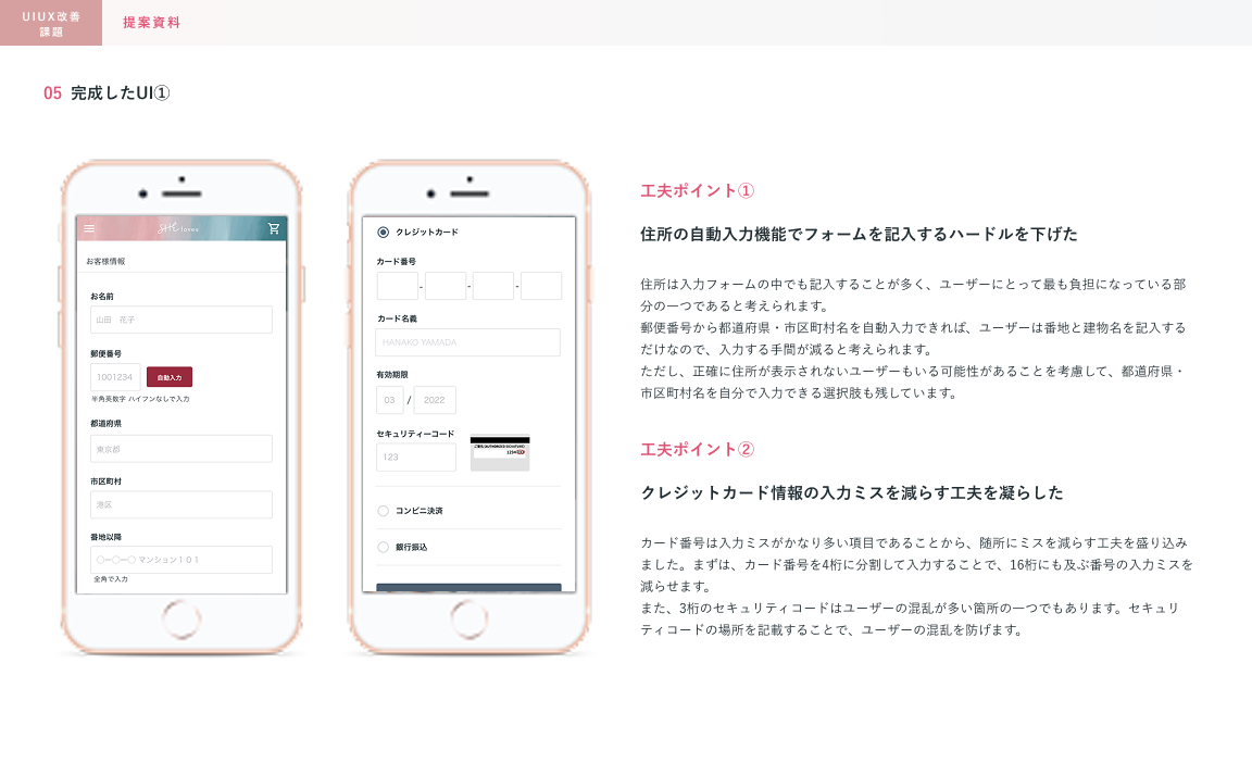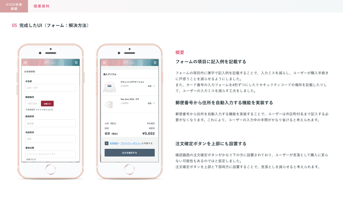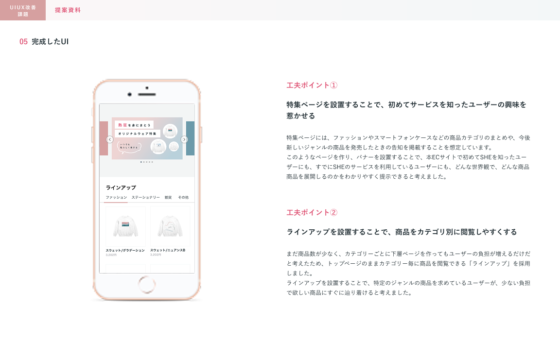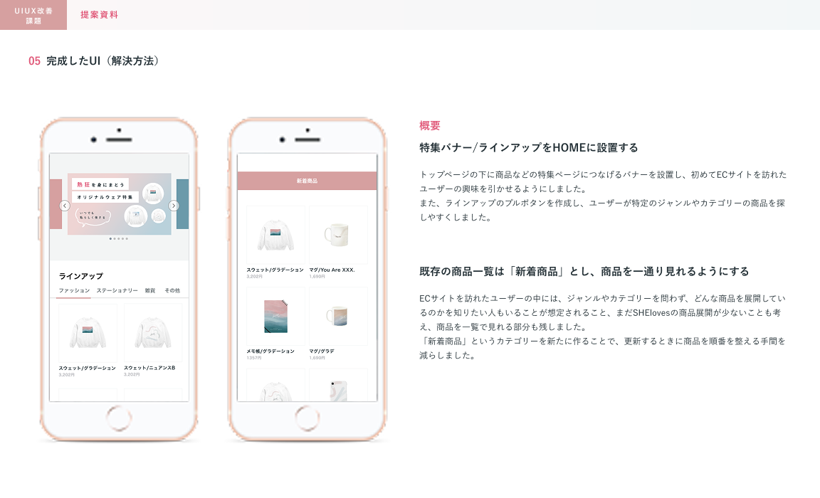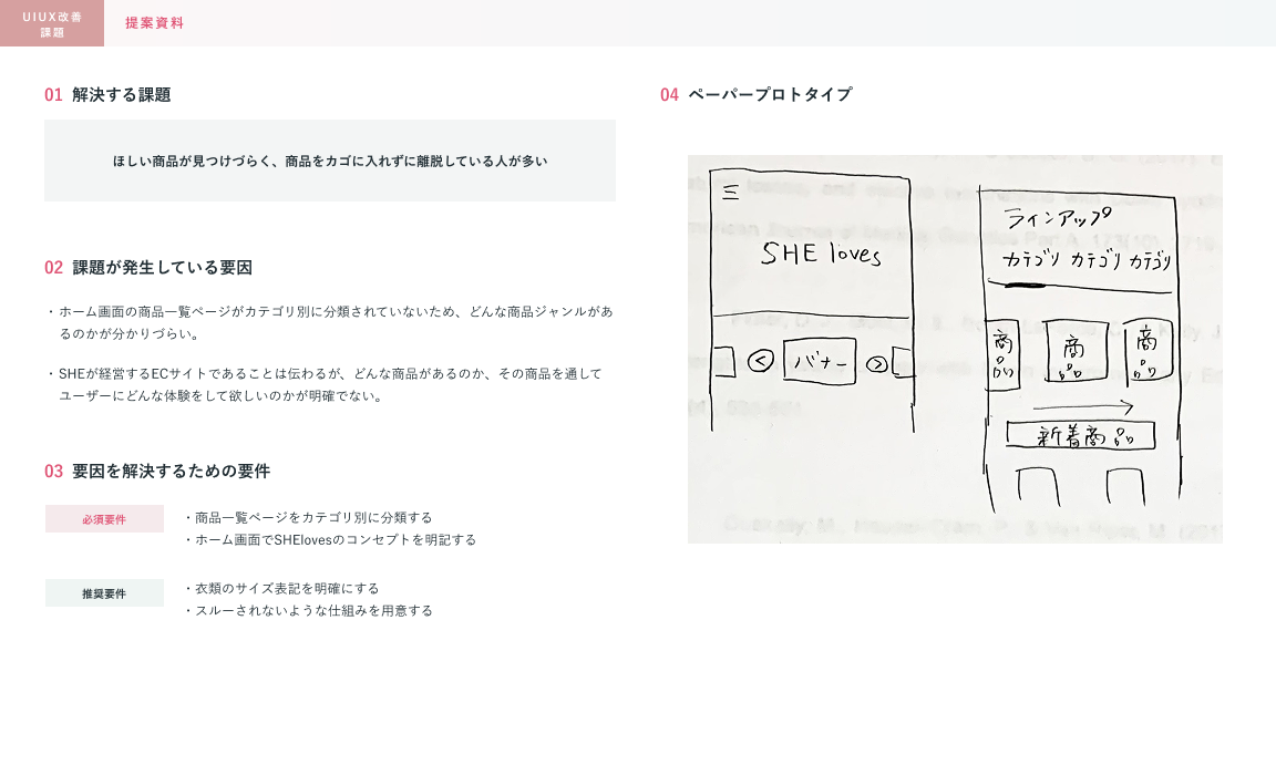オンラインキャリアスクール「SHElikes MULTI CREATOR COURSE」内の課題にて、実際のクライアントワークを想定したECサイトのUIUX改善に取り組みました。
